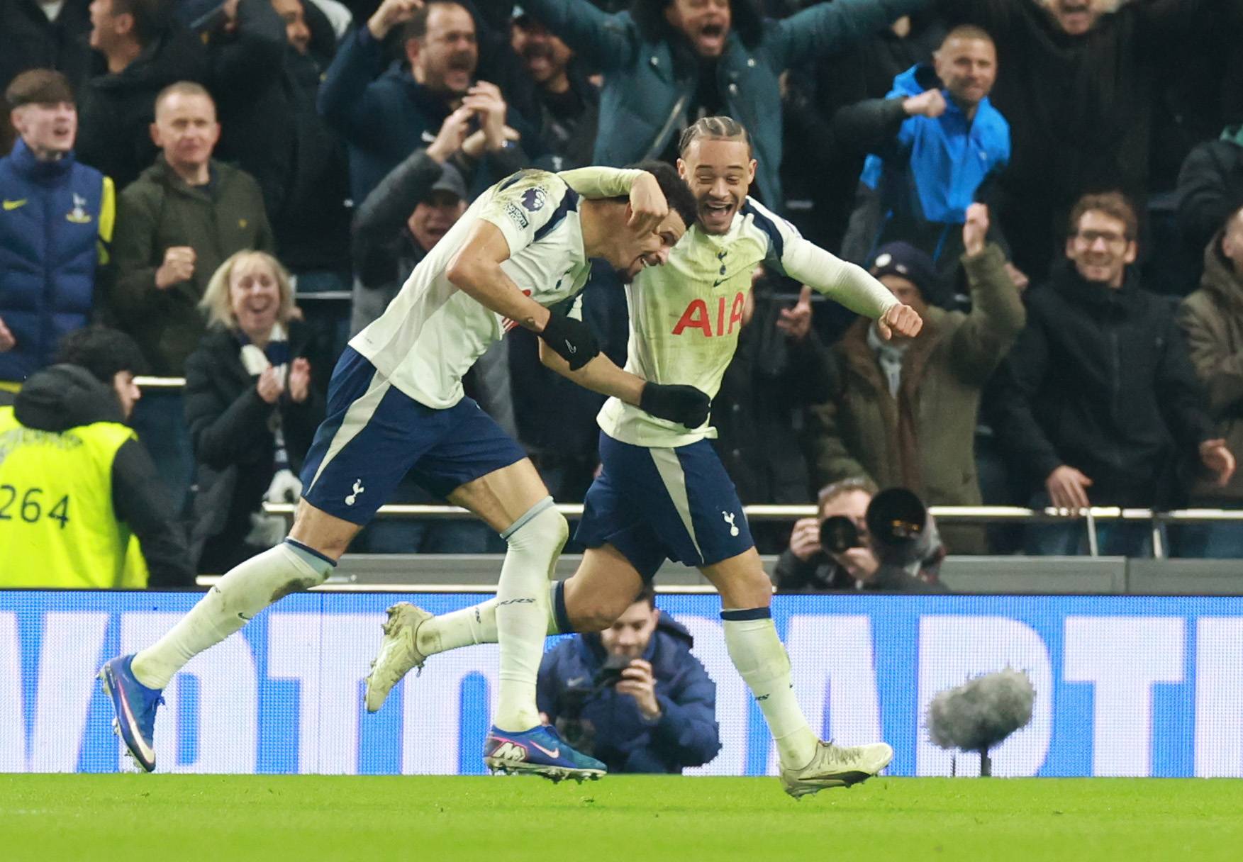 เมื่อวันที่ 1 กุมภาพันธ์ แทมมี่ อับราฮัม ของท็อตแน่ม ฮ็อตสเปอร์ (ซ้าย) ฉลองกับเพื่อนร่วมทีม แฮร์รี่ วิงค์ส หลังจากทำประตูที่สองให้กับทีมของเขา ซินหัว/EPA