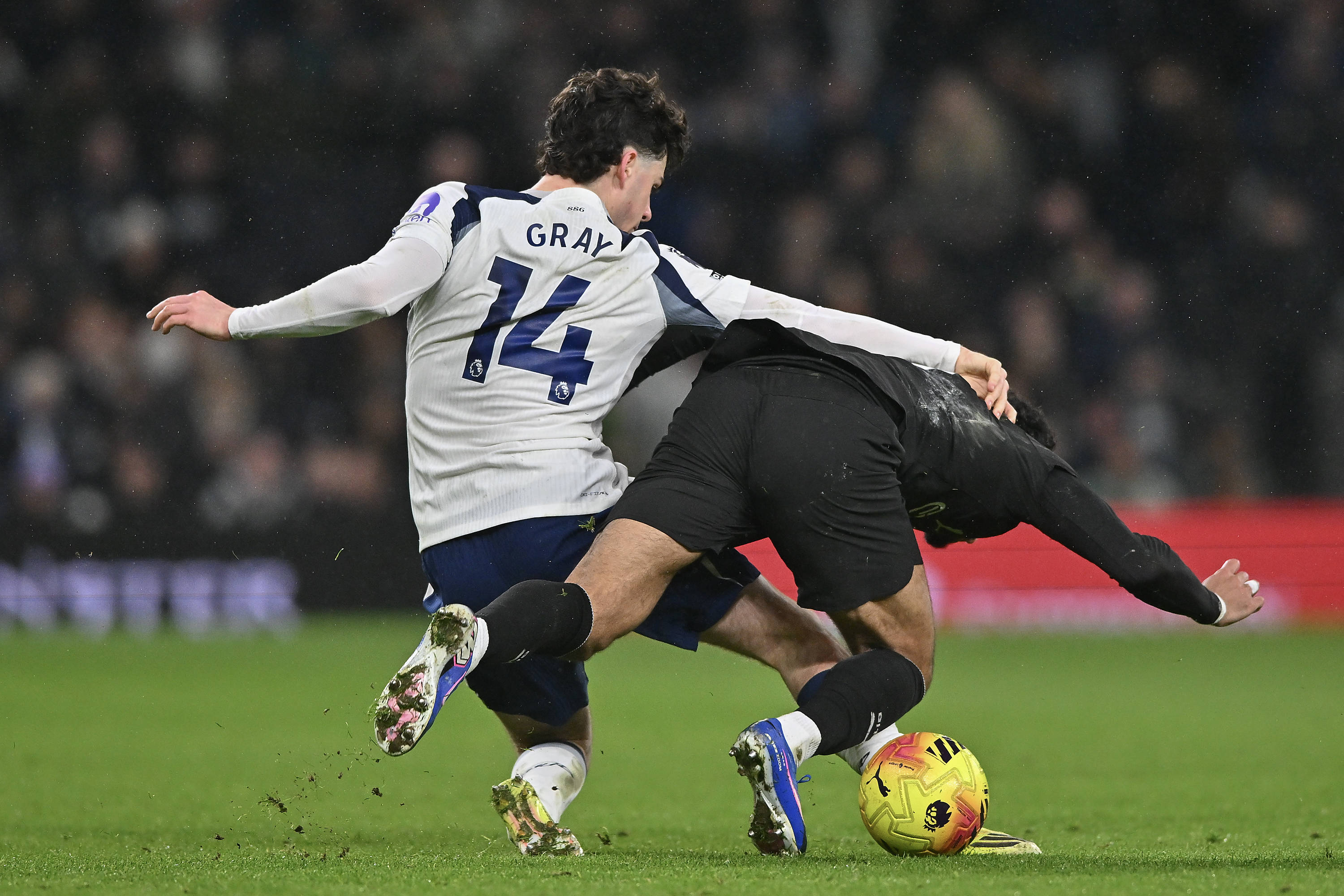 เมื่อวันที่ 1 กุมภาพันธ์ ซิลวาของแมนเชสเตอร์ ซิตี้ (ขวา) เข้าปะทะกับเกรย์ของท็อตแนม ฮ็อตสเปอร์ เพื่อแย่งบอล สำนักข่าวซินหัว