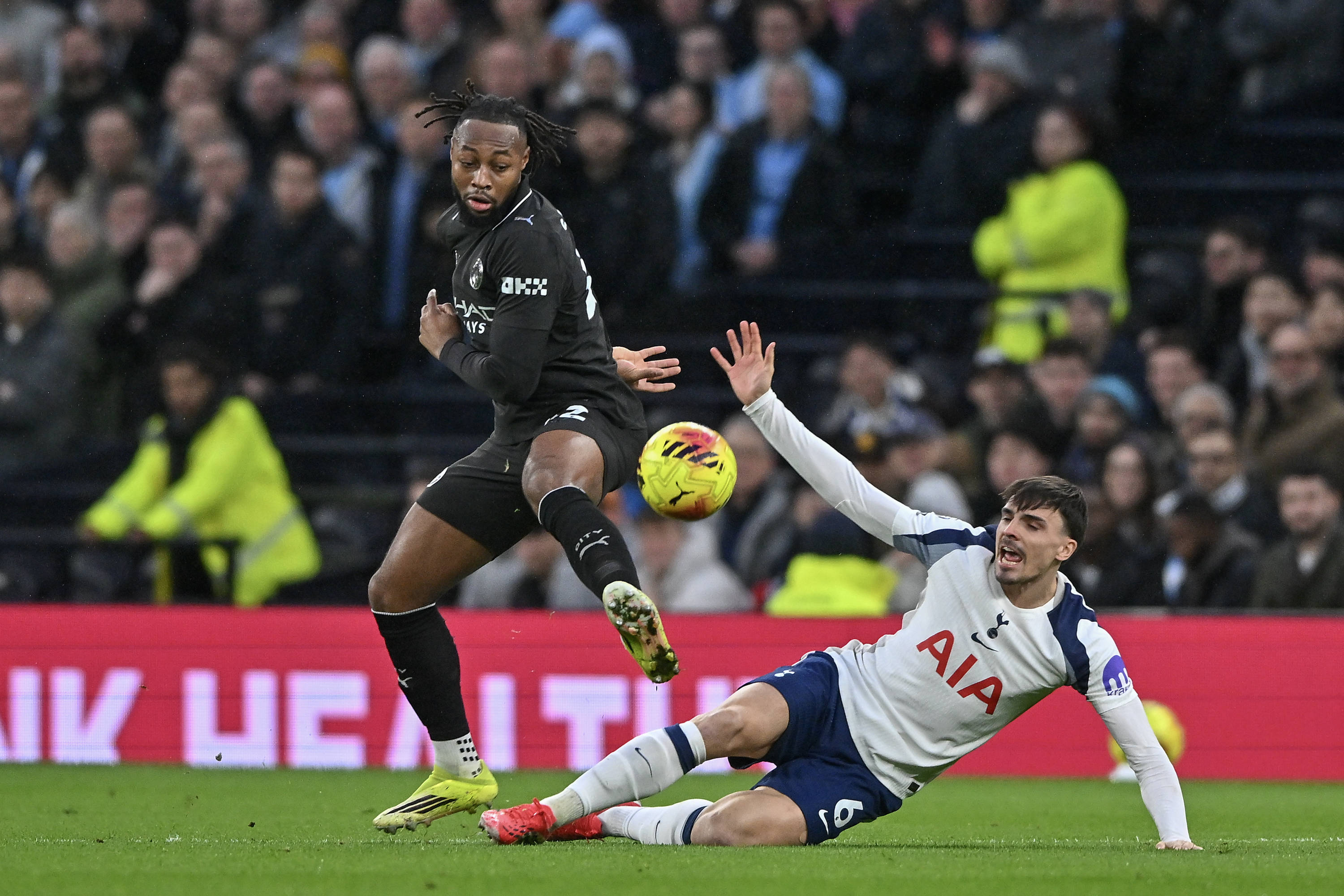 เมื่อวันที่ 1 กุมภาพันธ์ นูเนสของแมนเชสเตอร์ ซิตี้ (ขวา) เข้าปะทะกับมาติอัสของท็อตแน่ม ฮ็อตสเปอร์ เพื่อแย่งบอล สำนักข่าวซินหัว
