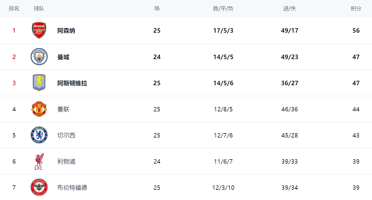 ในตารางลีก อาร์เซนอลครองตำแหน่งจ่าฝูงด้วย 56 คะแนนแมนเชสเตอร์ ซิตี้ ซึ่งลงเล่นน้อยกว่าหนึ่งนัด ยังคงรั้งอันดับสองด้วย 47 คะแนน แอสตัน วิลล่า ที่เก็บได้เพียงผลเสมอ มี 47 คะแนนเท่ากันและรั้งอันดับสาม อาร์เซนอลนำเป็นจ่าฝูงด้วยคะแนนนำ 9 แต้ม ทำให้การแข่งขันชิงแชมป์มีความแน่นอนมากขึ้นเรื่อยๆ แมนเชสเตอร์ ยูไนเต็ด คว้าชัยชนะอย่างต่อเนื่องทำให้มี 44 คะแนน คว้าอันดับสี่ไว้ได้ เชลซียังคงรั้งอันดับห้าด้วย 43 คะแนน ขณะที่ลิเวอร์พูลรั้งอันดับหกด้วย 39 คะแนน