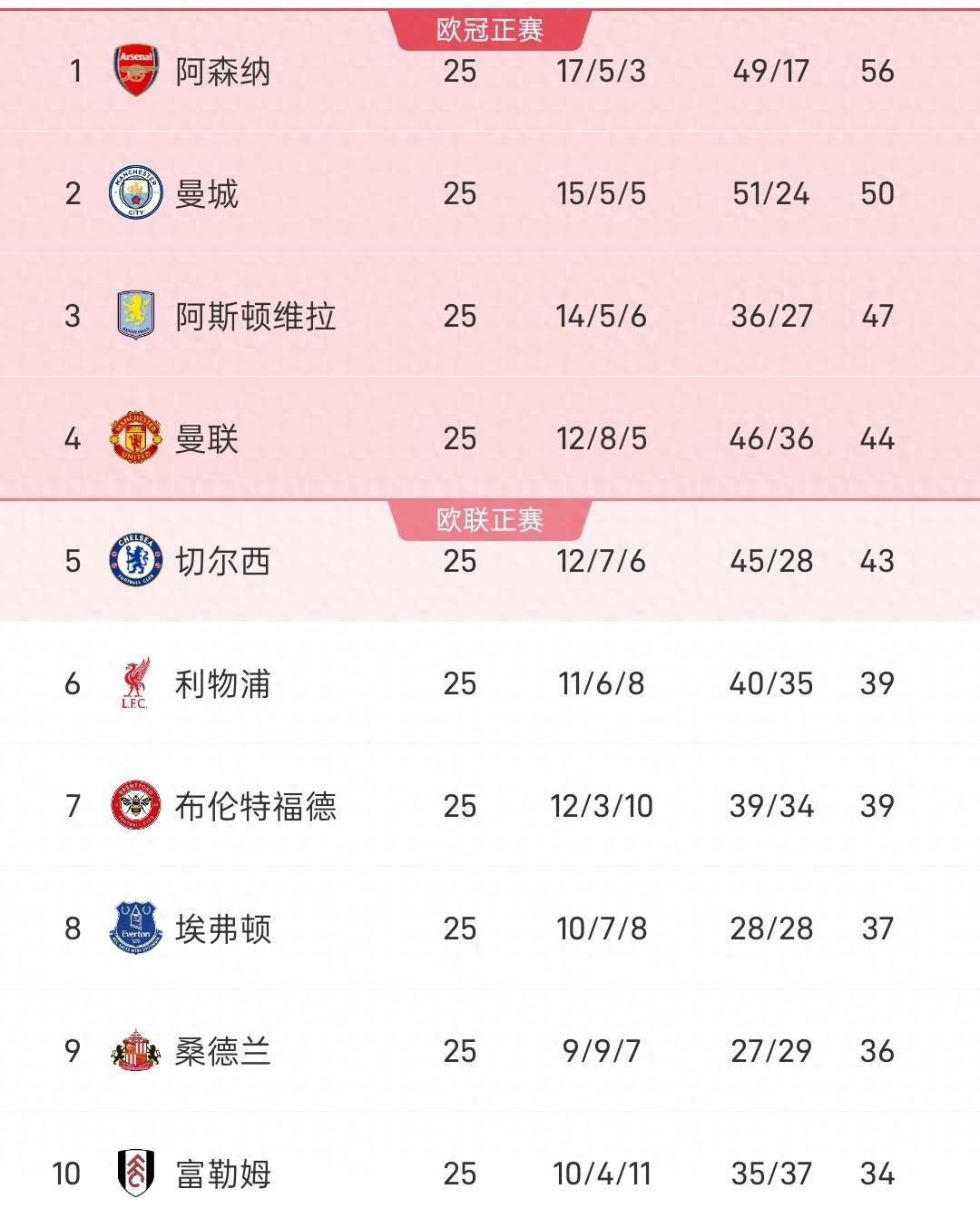 เมื่อวันที่ 9 กุมภาพันธ์ การแข่งขันพรีเมียร์ลีกนัดที่ 25 แมนเชสเตอร์ ซิตี้ พลิกกลับมาเอาชนะลิเวอร์พูลได้อย่างน่าตื่นเต้น 2-1 ขณะที่คริสตัล พาเลซ เฉือนชนะไบรท์ตัน 1-0 ผลตารางคะแนนล่าสุดเผยว่า อาร์เซนอล นำเป็นจ่าฝูงอย่างสบายด้วย 56 คะแนน แมนเชสเตอร์ ซิตี้ อยู่อันดับสองมี 50 คะแนน แอสตัน วิลล่า ครองอันดับสามด้วย 47 คะแนน แมนเชสเตอร์ ยูไนเต็ด ทำผลงานได้อย่างน่าประทับใจรั้งอันดับสี่ด้วย 44 คะแนน ส่วนเชลซีอยู่อันดับห้าด้วย 43 คะแนนแชมป์เก่าที่มี 39 คะแนน ได้ถูกตัดออกจากเส้นทางการลุ้นแชมป์แล้ว!