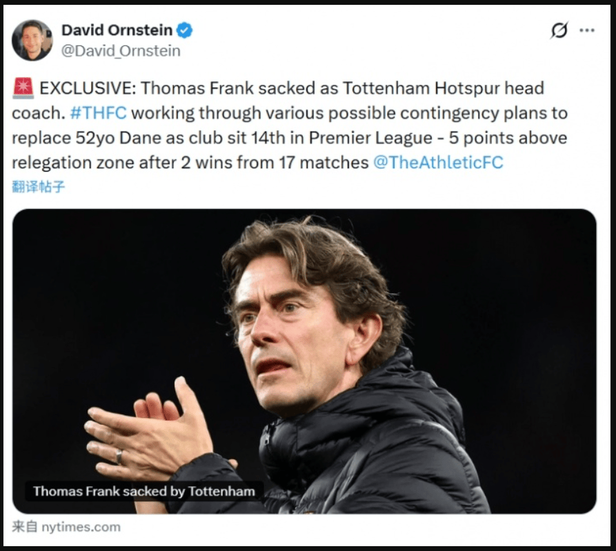 บ่ายวันนี้ตามเวลาปักกิ่ง รายงานพิเศษจากเดวิด ออร์นสตีนของ The Athletic ยืนยันว่า โธมัส ฟรังค์ ผู้จัดการทีมท็อตแนม ฮ็อตสเปอร์ ถูกไล่ออกแล้ว โดยทีมอยู่ในอันดับที่ห้าเหนือโซนตกชั้นเพียงห้าคะแนน
