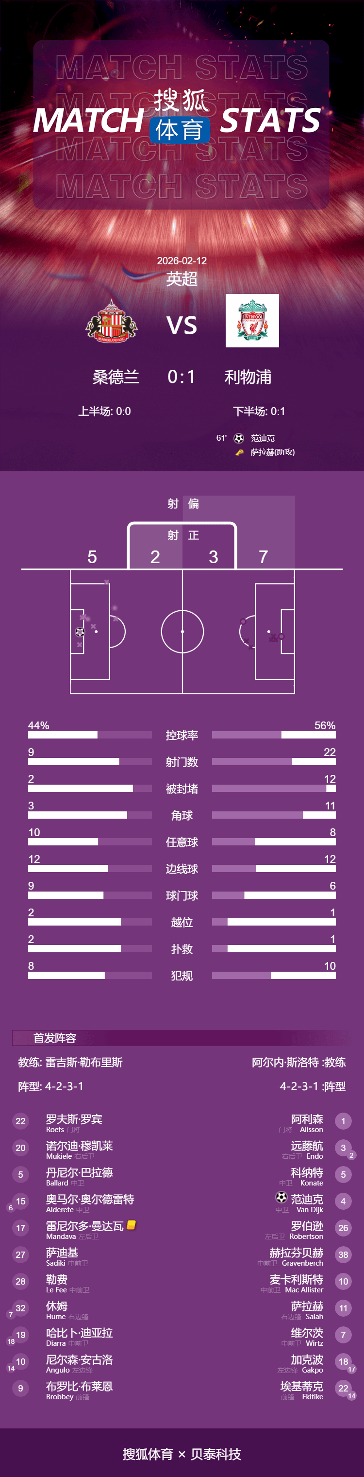 เวลา 04:15 น. ตามเวลาปักกิ่ง วันที่ 12 กุมภาพันธ์ การแข่งขันพรีเมียร์ลีกฤดูกาล 2025-26 นัดที่ 26 ยังคงดำเนินต่อไป โดยลิเวอร์พูลสามารถเอาชนะซันเดอร์แลนด์ได้ 1-0 ที่สนามสเตเดียมออฟไลท์ ซึ่งนับเป็นชัยชนะนัดแรกใน 4 นัดเยือนติดต่อกันในลีก และเป็นการยุติสถิติไม่แพ้ใครในบ้านของซันเดอร์แลนด์ในลีกฤดูกาลนี้ ลิเวอร์พูลยังคงอยู่ในอันดับที่ 6 ของตารางพรีเมียร์ลีก ตามหลังท็อปไฟว์อยู่ 2 คะแนนประตูเดียวของเกมเกิดขึ้นในนาทีที่ 61 เมื่อโมฮาเหม็ด ซาลาห์ เปิดลูกเตะมุมให้เวอร์จิล ฟาน ไดจ์ก โหม่งเข้าประตูไป