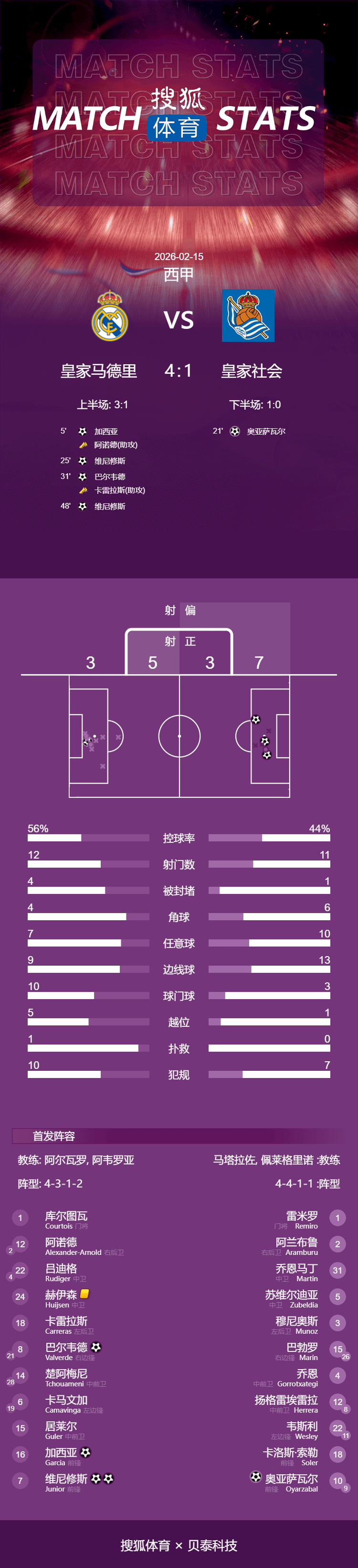 เวลา 04:00 น. ตามเวลาปักกิ่ง วันที่ 15 กุมภาพันธ์ การแข่งขันนัดสำคัญในรอบที่ 24 ของฤดูกาลลาลีกา 2025-2026 ได้เริ่มต้นขึ้น โดยเรอัล มาดริดเปิดบ้านต้อนรับการมาเยือนของเรอัล โซเซียดาด ในครึ่งแรก อาร์โนลด์จ่ายบอลให้กอนซาโลทำประตูจากระยะเผาขน ไฮเซนทำฟาวล์เฮอร์เรราจนเสียจุดโทษ ซึ่งโอเยร์ซาบาลยิงเข้าไปตีเสมอวินิซิอุส จูเนียร์ ถูกอัลลัน บรู ทำฟาวล์ล้มลงหลังเลี้ยงบอล ทำให้กาลาคติกอสได้จุดโทษอีกครั้งซึ่งเขาเปลี่ยนเป็นประตูได้สำเร็จ จากนั้นคาราเรสจ่ายบอลให้วัลแวร์เดยิงโค้งเข้าประตูไป ในครึ่งหลัง วินิซิอุสได้จุดโทษอีกครั้งและยิงเข้าไปอย่างเยือกเย็น สุดท้ายเรอัล มาดริดเอาชนะเรอัล โซเซียดาดไปอย่างสบายๆ 4-1 ในบ้าน ขยายสถิติชนะติดต่อกันในลาลีกาเป็น 8 นัด และด้วยการมีเกมในมือมากกว่าหนึ่งนัด พวกเขาแซงบาร์เซโลนาขึ้นไปรั้งจ่าฝูงชั่วคราว