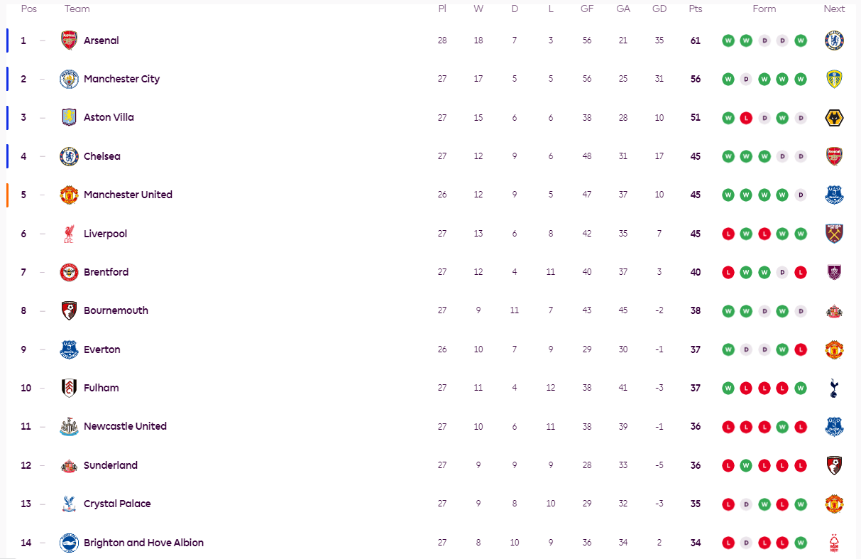 ตารางคะแนนพรีเมียร์ลีก: อาร์เซนอล 4-1 อยู่ในสถานการณ์เสี่ยงตกชั้น; สิงห์บลูส์, ยูไนเต็ด และหงส์แดงมีคะแนนเท่ากัน_เชลซี_แมนเชสเตอร์ ซิตี้_ลิเวอร์พูล