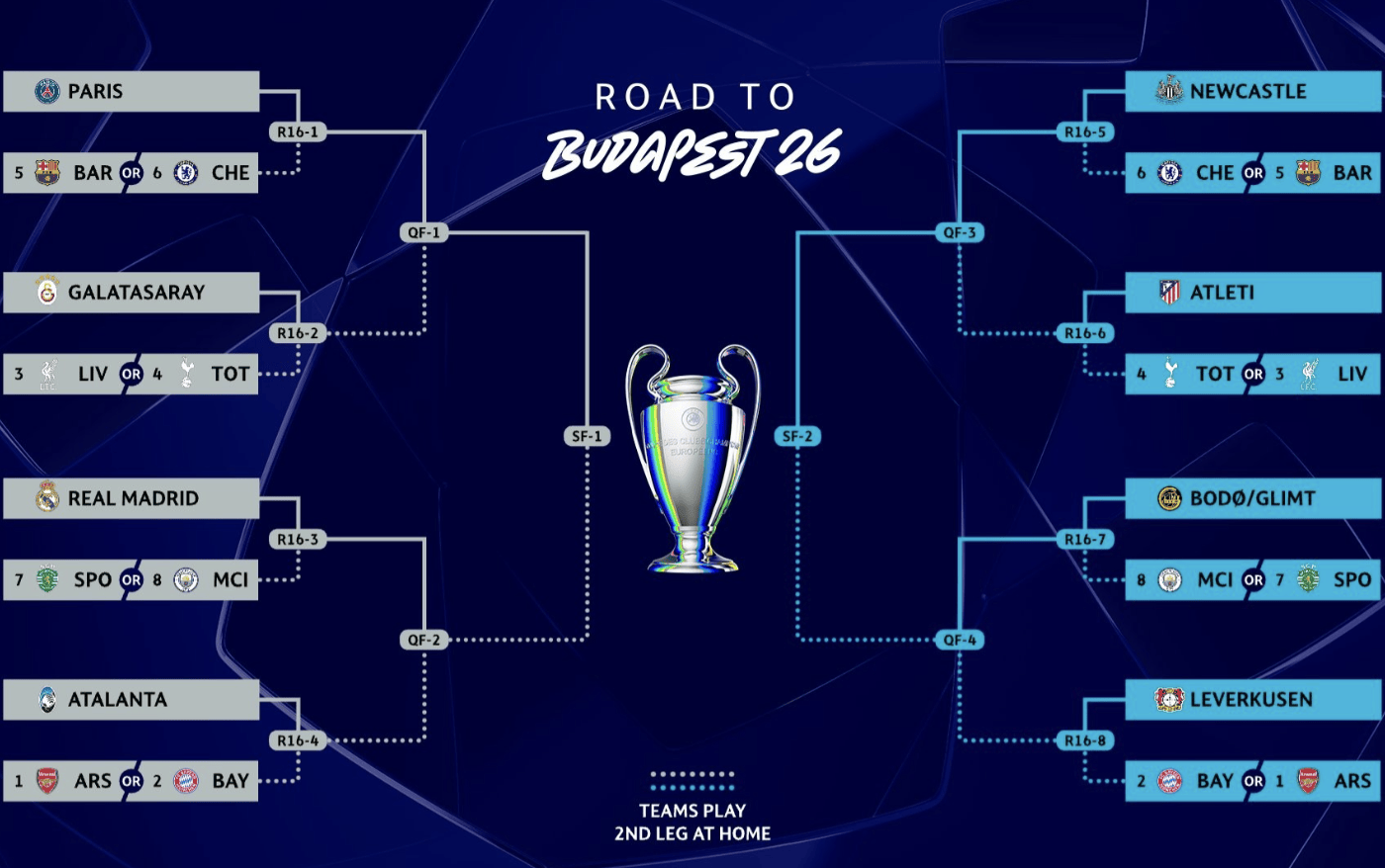 ลิเวอร์พูลและท็อตแน่ม ฮ็อตสเปอร์จะต้องพบกับแอตเลติโก มาดริดหรือกาลาตาซาราย โดยทั้งสองทีมจากพรีเมียร์ลีกต้องเจอกับคู่แข่งที่ไม่เป็นใจ แอตเลติโกเป็นคู่ต่อสู้ที่น่าเกรงขาม ทีมของดิเอโก้ ซิเมโอเน่ขึ้นชื่อว่าเป็นทีมที่ยากจะรับมือ และแม้ว่าจะผ่านเข้ารอบไปได้ ก็จะต้องเป็นการต่อสู้ที่เหน็ดเหนื่อย ส่วนกาลาตาซารายนั้นมีความได้เปรียบในบ้านอย่างชัดเจน โดยเคยเอาชนะลิเวอร์พูล 1-0 บนแผ่นดินตุรกีมาแล้วไม่ว่าจะเจอกับลิเวอร์พูลหรือท็อตแน่ม ผลการแข่งขันของแอตเลติโก มาดริดยังคงคาดเดาได้ยาก