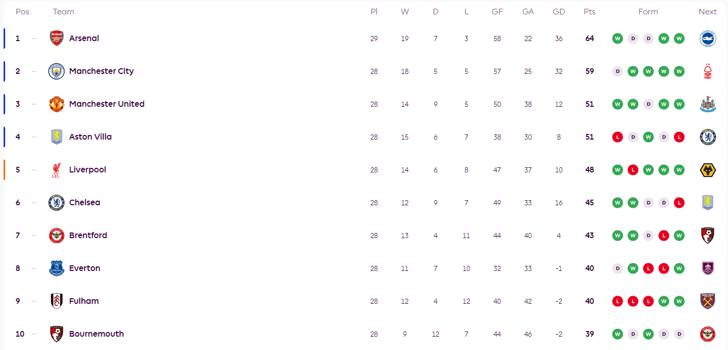 ตารางคะแนนพรีเมียร์ลีก: อาร์เซนอลกลับมานำห้าแต้ม; ยูไนเต็ดขึ้นอันดับสาม, การไล่ตามท็อปไฟว์ของสิงห์บลูส์ชะงัก _เชลซี_, _แอสตัน วิลล่า_, _ลิเวอร์พูล_