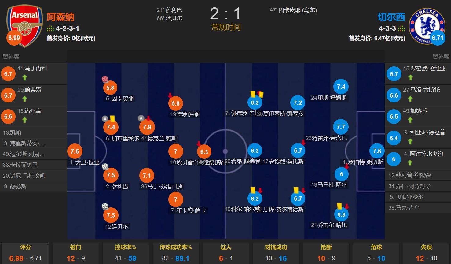 ครึ่งแรก: อาร์เซนอลได้เตะมุม กาเบรียลโหม่งบอลผ่านหน้าประตู ซาลิบาโหม่งซ้ำเข้าไป เชลซีได้เตะมุม เจมส์บังคับให้อินคา-ปีทำเข้าประตูตัวเอง สกอร์ครึ่งแรก 1-1ในครึ่งหลัง อาร์เซนอลกลับมาขึ้นนำอีกครั้งจากลูกเตะมุม โดยไรซ์จ่ายบอลให้ทิมเบอร์โหม่งทำประตู เนโต้ถูกไล่ออกในนาทีที่ 70 ทำให้เชลซีเหลือผู้เล่นน้อยกว่าและไม่สามารถตีเสมอได้