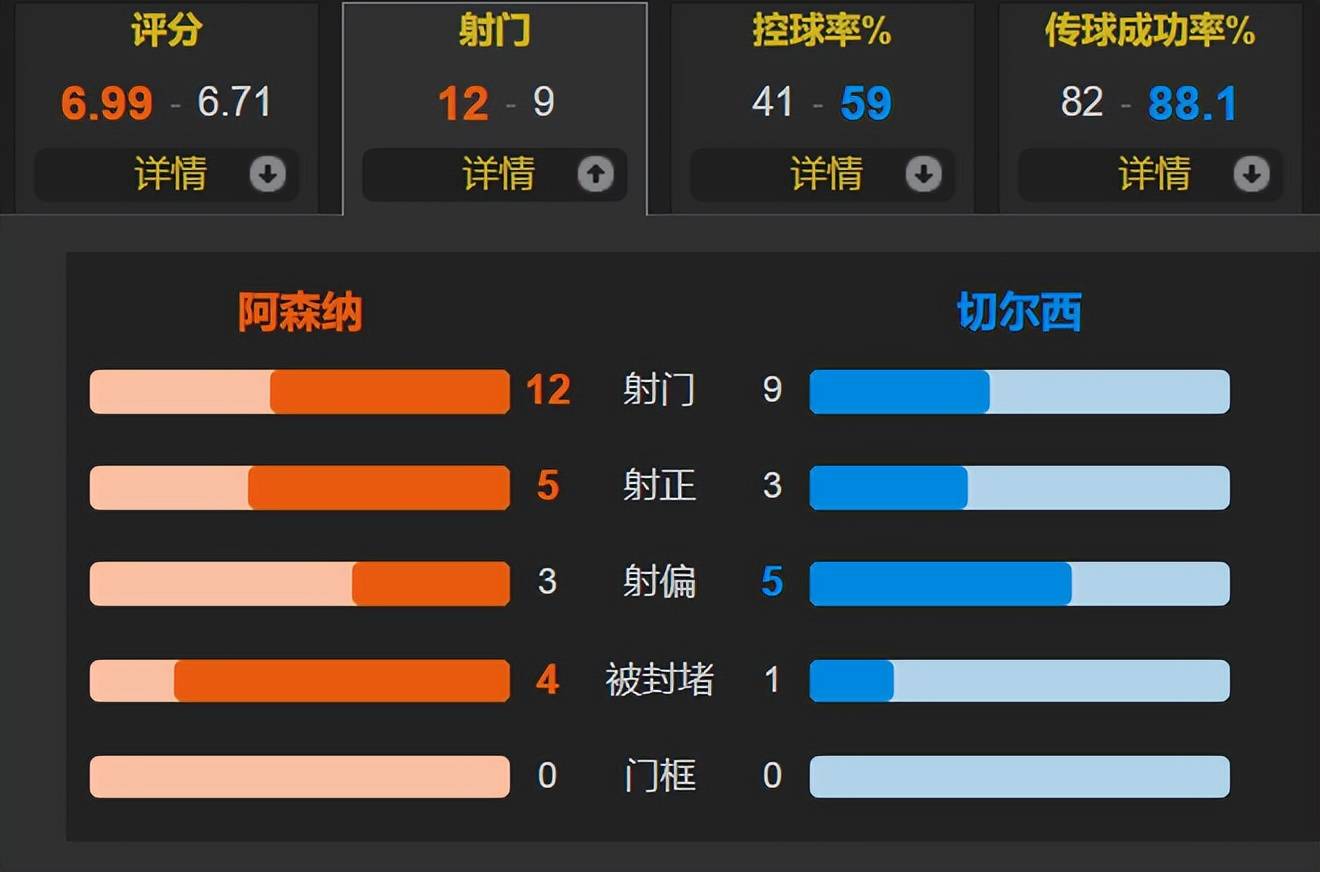 ตลอดการแข่งขัน อาร์เซนอลครองบอลได้ 41% แม้จะมีผู้เล่นมากกว่าหนึ่งคนในสนาม พวกเขาทำการยิง 12 ครั้ง โดยมี 5 ครั้งที่เข้ากรอบ ส่วนเชลซีทำการยิง 9 ครั้ง โดยมี 3 ครั้งที่เข้ากรอบ