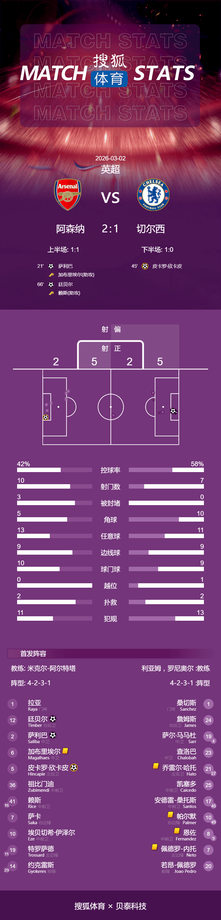 เวลา 00:30 น. ตามเวลาปักกิ่ง วันที่ 2 มีนาคม อาร์เซนอลเปิดบ้านรับการมาเยือนของเชลซี ในการแข่งขันพรีเมียร์ลีกนัดที่ 28 ของฤดูกาล ในครึ่งแรก ซาลิบาโหม่งลูกเตะมุมเข้าไปให้ปืนใหญ่ขึ้นนำ แต่รีซ เจมส์ก็ทำประตูให้ตัวเองโดยอิลคานในช่วงทดเวลาบาดเจ็บ ทำให้ทั้งสองทีมเสมอกัน 1-1 เมื่อจบครึ่งแรกในครึ่งหลัง อาร์เซนอลกลับมาขึ้นนำอีกครั้งจากลูกเตะมุมอีกครั้ง เนโต้ถูกไล่ออกจากสนามหลังจากได้รับใบเหลืองที่สอง ขณะที่รายาเซฟลูกสำคัญหลายครั้งเพื่อรักษาชัยชนะไว้ได้ อาร์เซนอลเอาชนะเชลซีไปได้ 2-1 รักษาคะแนนนำ 5 แต้มเหนือแมนเชสเตอร์ ซิตี้ ทีมอันดับสอง โดยแข่งมากกว่า 1 นัด