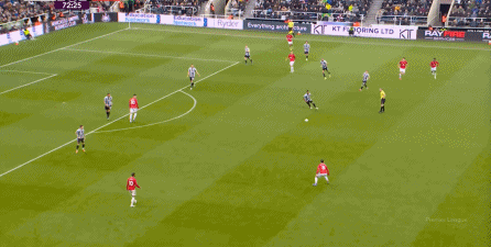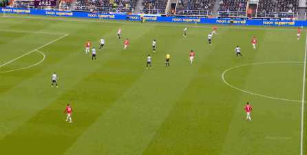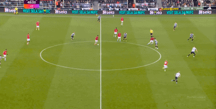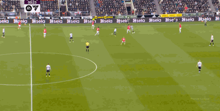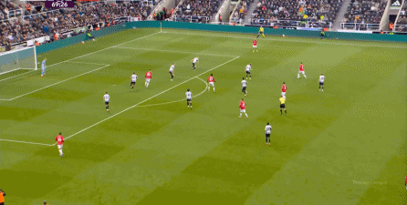 ก่อนและหลัง 30 นาที ความเข้มของนิวคาสเซิ่ลก็ลดลงในระดับหนึ่ง การเผชิญหน้าและข้อได้เปรียบในการวิ่งของพวกเขาในพื้นที่กองกลางนั้นไม่ชัดเจนเท่าเวทีเปิดอีกต่อไป และความถี่ของการเปลี่ยนบอลก็เพิ่มขึ้น แมนเชสเตอร์ ยูไนเต็ด ได้เล่นเนื้อหาบางอย่าง ตัวอย่างเช่นภายใต้การยับยั้งของแนวหน้า บรูโน่ใช้บริเวณซี่โครงเพื่อส่งผ่านด้านหน้าไปยังด้านหน้าหลังจากออกจากตำแหน่งเอวด้านหน้า คราวนี้เขาพบเชชโกและคูเนียและโจมตีต่อหน้าเป้าหมาย: