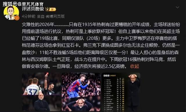 "หายนะ 2569. ...... เฉพาะในปี 1935 ท็อตแนมมีปีแรกที่แย่กว่านั้น แฟนบอลในบ้านได้ใช้การออกก่อนเพื่อประท้วง ท็อตแนมเป็นแชมป์ยูโรปาลีกในฤดูกาลที่แล้ว! แต่พวกเขาแพ้ 19 เกมในพรีเมียร์ลีกตั้งแต่ฤดูกาลที่แล้ว โดยมีเพียงวูล์ฟส์ (20 เกม) ในช่วงเวลาเดียวกันมากกว่า"