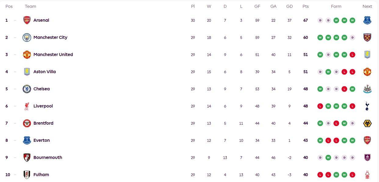 อย่างไรก็ตาม แนวการแข่งขันของลีกกำลังเปลี่ยนแปลงอย่างรวดเร็ว ในอันดับแม้ว่าอาร์เซนอลจะอยู่ข้างหน้าชั่วคราว แต่แมนเชสเตอร์ซิตี้ที่อยู่เบื้องหลังพวกเขากำลังไล่ตาม และความสงสัยในการแข่งขันชิงแชมป์ยังคงมีอยู่ การแข่งขันเพื่อชิงแชมป์ลีก แชมเปี้ยนส์ ลีก ยิ่งดุเดือดยิ่ง แมนเชสเตอร์ ยูไนเต็ด, แอสตัน วิลล่า, เชลซี และลิเวอร์พูล ทำได้น้อยมาก และผลของแต่ละเกมอาจเปลี่ยนอันดับสุดท้าย
