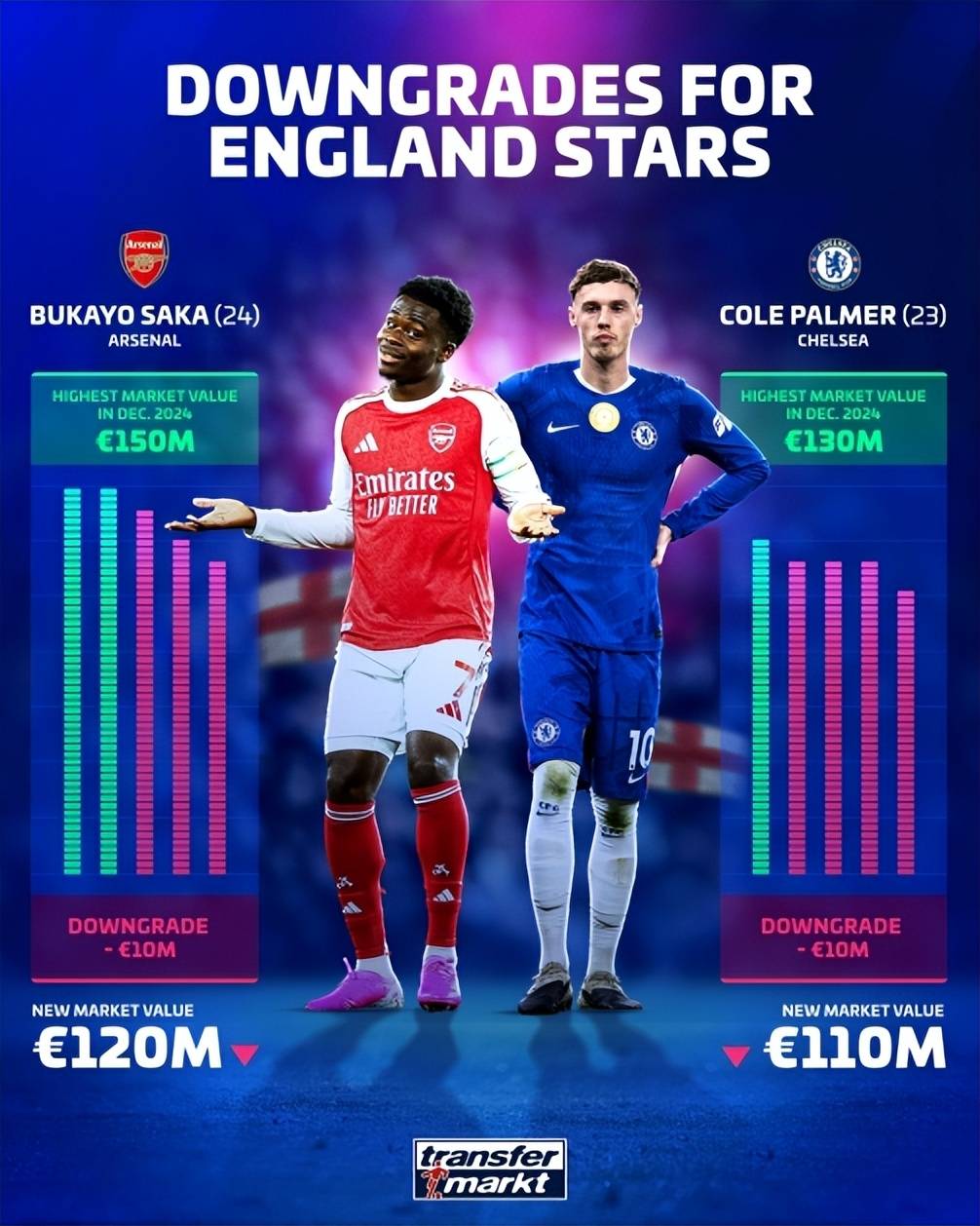 ในแง่ของผู้เล่นอังกฤษ การย้ายทีมของเยอรมันจะอัปเดตมูลค่าของผู้เล่นพรีเมียร์ลีกในครั้งนี้ และผู้โจมตีชาวอังกฤษสองคนของทั้ง Saka และ Palmer ได้ลดคุณค่าของพวกเขาลง Tuchelle จำเป็นต้องเลือกทางเลือกที่ดีสำหรับฟุตบอลโลก 2026 ที่สหรัฐอเมริกา แคนาดา และเม็กซิโก