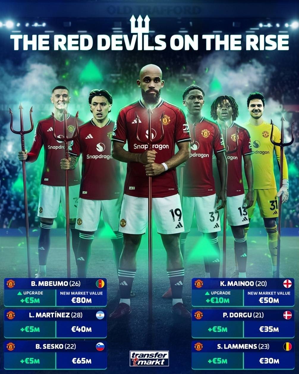 ในแง่ของแมนเชสเตอร์ยูไนเต็ดด้วยสถิติที่แข็งแกร่งของคาร์ริคหลังจากเข้ารับตำแหน่งเยอรมนีได้เปลี่ยนมูลค่าของผู้เล่นพรีเมียร์ลีกในครั้งนี้และแมนเชสเตอร์ยูไนเต็ดได้เพิ่มขึ้น 8 ซึ่ง Mbermo ได้เพิ่มขึ้นเป็น 80 ล้านยูโรซึ่งเป็นมูลค่าแรกในแมนเชสเตอร์ยูไนเต็ด; Sheshko เพิ่มขึ้นเป็น 65 ล้านยูโรซึ่งเป็นอันดับสองในแมนเชสเตอร์ยูไนเต็ด
