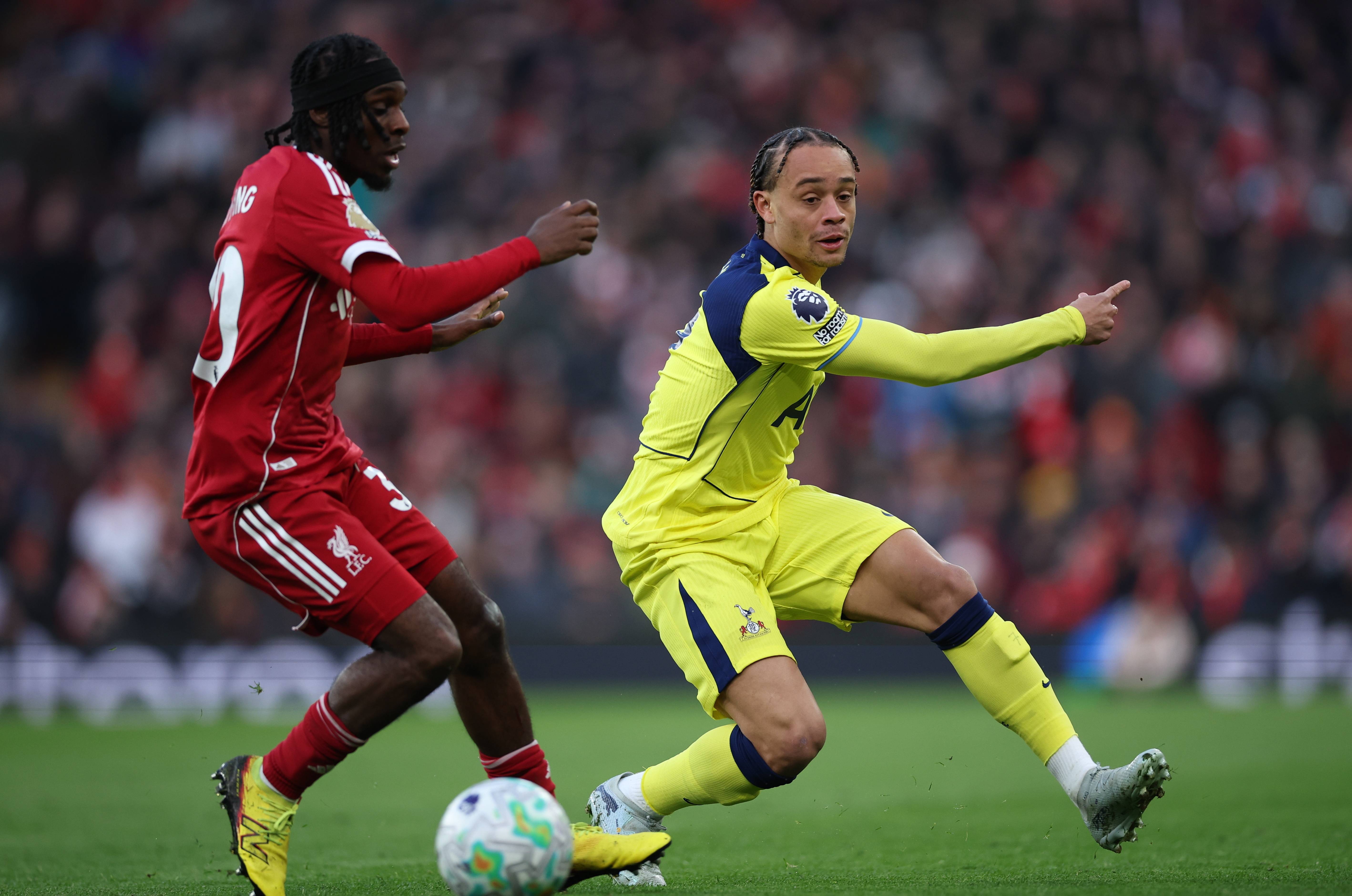 ผู้เล่น Liverpool Flymong (ซ้าย) ในวันที่ 15 มีนาคม ต่อสู้กับ Simmons ผู้เล่น Tottenham Hotspur สำนักข่าวซินหัว/OU XIN