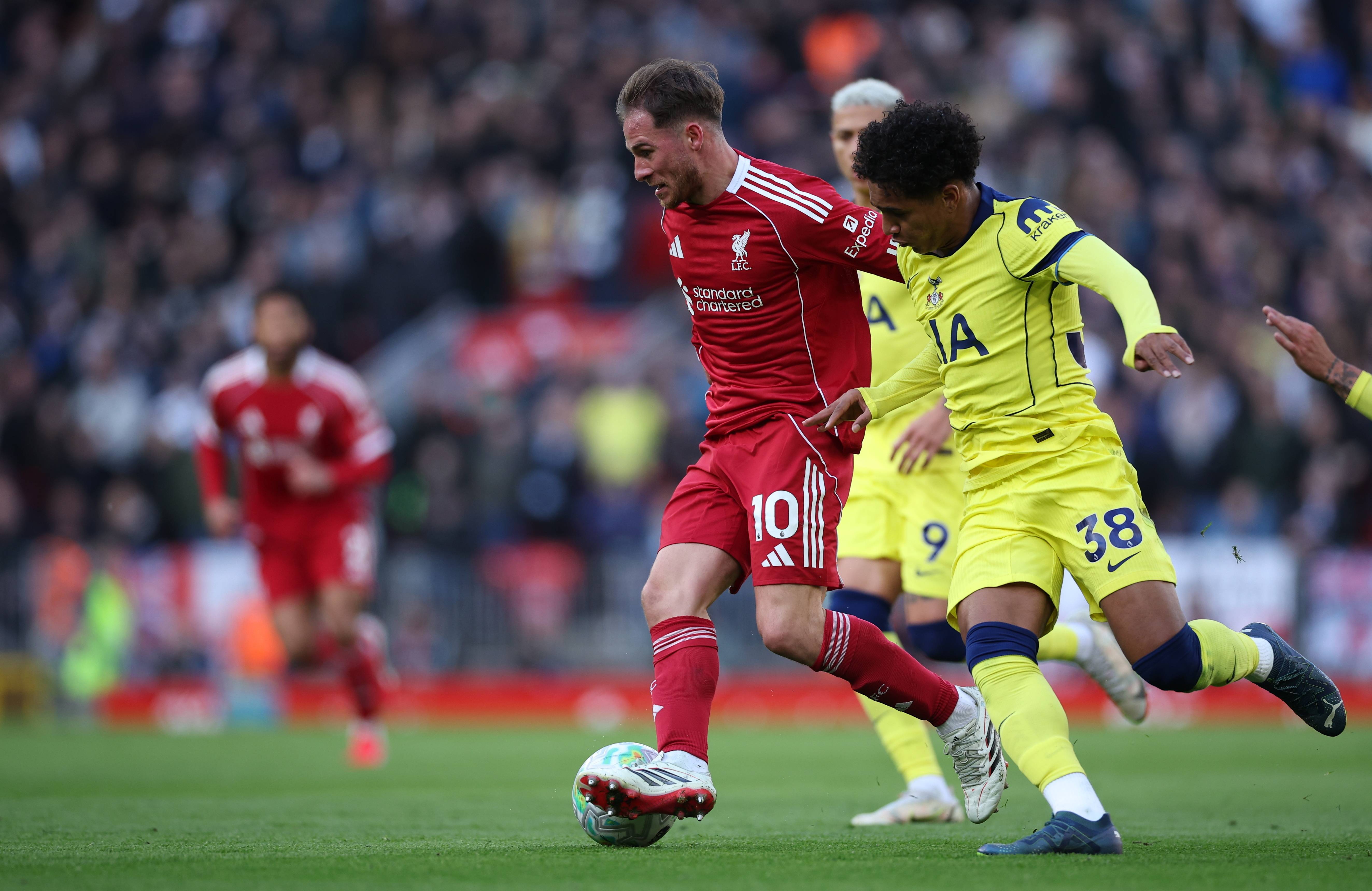 ผู้เล่น Liverpool ของ McCallister (ซ้าย) เมื่อวันที่ 15 มีนาคม ต่อสู้กับผู้เล่น Tottenham Hotspur สำนักข่าวซินหัว/OU XIN