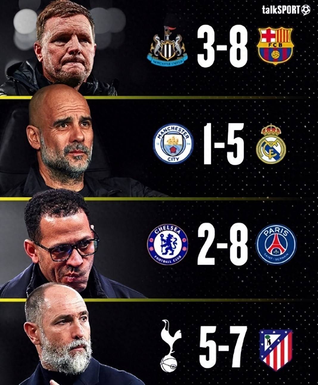 เชลซีและแมนเชสเตอร์ ซิตี้ เป็นอันตรายต่อพรีเมียร์ลีกอย่างมาก และเชลซีถูกปารีสฆ่าสองครั้งโดยมีช่องว่าง 3 ประตูทั้งในบ้านและนอกบ้าน ในช่วง 4 ปีที่ผ่านมา เชลซีเป็นสโมสรที่ใช้จ่ายบอลมากที่สุด แต่การถูกปารีส 2-8 ซัดไปนั้นแพ้จริงๆ และรอบต่อไปก็เพิ่มขึ้นที่สแตมฟอร์ด บริดจ์ สู่เดอะบลูส์