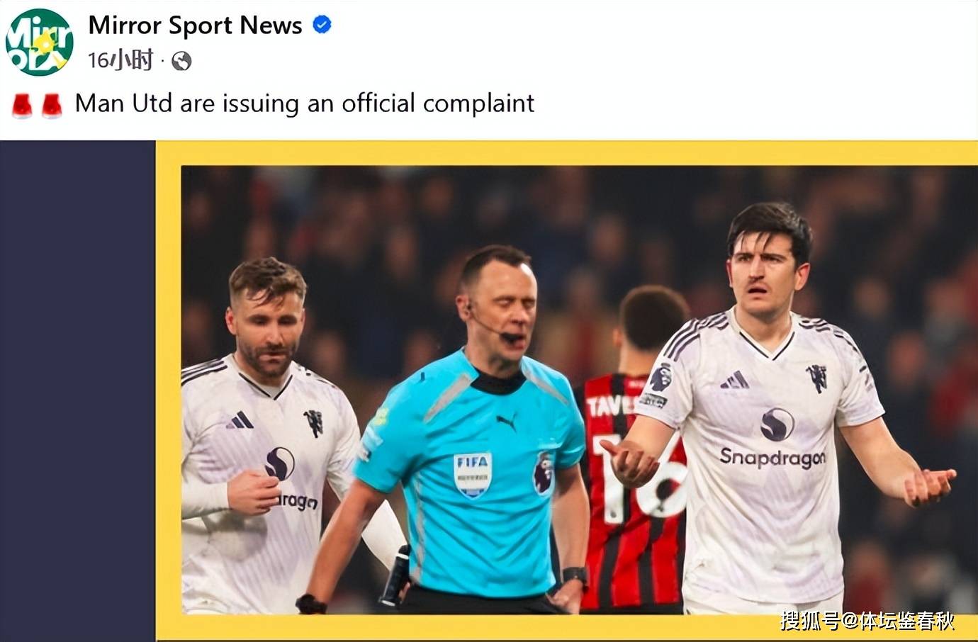 หลังเกมกับบอร์นมัธ แมนเชสเตอร์ ยูไนเต็ด ตัดสินใจลงมือ สโมสรได้ยื่นเรื่องร้องเรียนอย่างเป็นทางการกับพรีเมียร์ลีกเกมลีกผู้ตัดสินเกมแสดงความไม่พอใจกับบทลงโทษที่สำคัญหลายรายการในการเสมอ 2-2 แมนเชสเตอร์ ยูไนเต็ด โยนปัญหาให้โฮเวิร์ด เวบบ์ ผู้กำกับผู้ตัดสินโดยตรง โดยหวังว่าจะได้รับการอธิบาย นอกจากจุดโทษที่แตกต่างอย่างเห็นได้ชัด พวกเขายังตั้งคำถามว่าเวลาเสริมนั้นสมเหตุสมผลเป็นเวลา 9 นาทีหรือไม่?