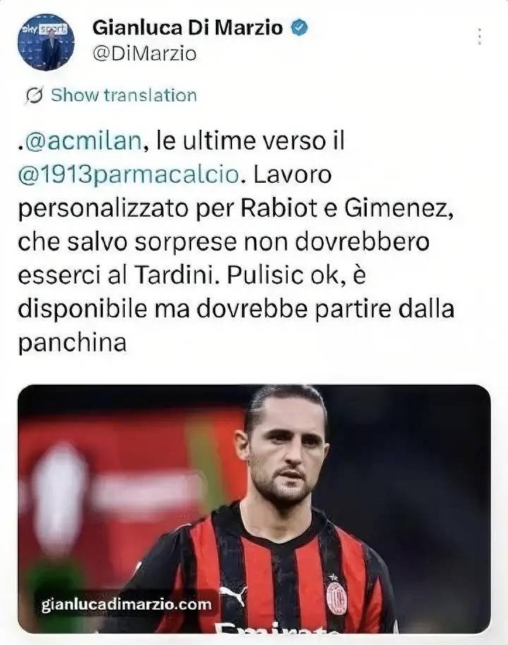 สื่ออิตาลีรายงาน: ความคืบหน้าในการฟื้นตัวของพูลิซิชเป็นไปอย่างยอดเยี่ยม เขาจะเริ่มต้นบนม้านั่งสำรองในเกมกับปาร์มาและรอโอกาสของเขา