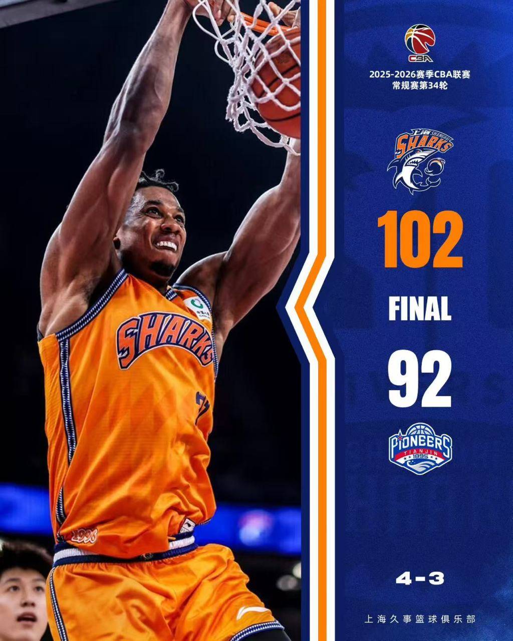 เมื่อช่วงเย็นของวันที่ 3 เมษายน ตามเวลาปักกิ่ง ในรอบ 34 ทีมบาสเกตบอลชายเซี่ยงไฮ้ เล่นกับ ทีมบาสเกตบอลชายเทียนจินที่บ้าน ทีมบาสเกตบอลชายเซี่ยงไฮ้ที่ได้ชัยชนะติดต่อกัน 14 ครั้ง ยังคงเก็บชัยชนะได้อย่างต่อเนื่อง ในท้ายที่สุดก็คว้าชัยชนะติดต่อกันเป็นครั้งที่ 15 และยังคงครองอันดับหนึ่งต่อไปในฤดูกาลปกติ นำหน้า กว่างชา คว้าแชมป์เกม 5 เกม.