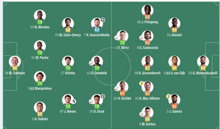 ในแง่ของผู้เล่น ผู้เล่นตัวจริงของปารีส ได้แก่ Suffolov, Ashraf, Marchinhos, Pacio, Nuno Mendes, Vitinia, Joao Neves, Emery, Dembele, Due และ Kvaras Helia ลิเวอร์พูลส่ง Marmal Dashvilli, Joe Gomez, Van Dek, Contra, Kelzz, Sobosloy, Herhenbeh, McList, Flympong, Werz และ Ekitik เป็นผู้เล่นตัวจริง