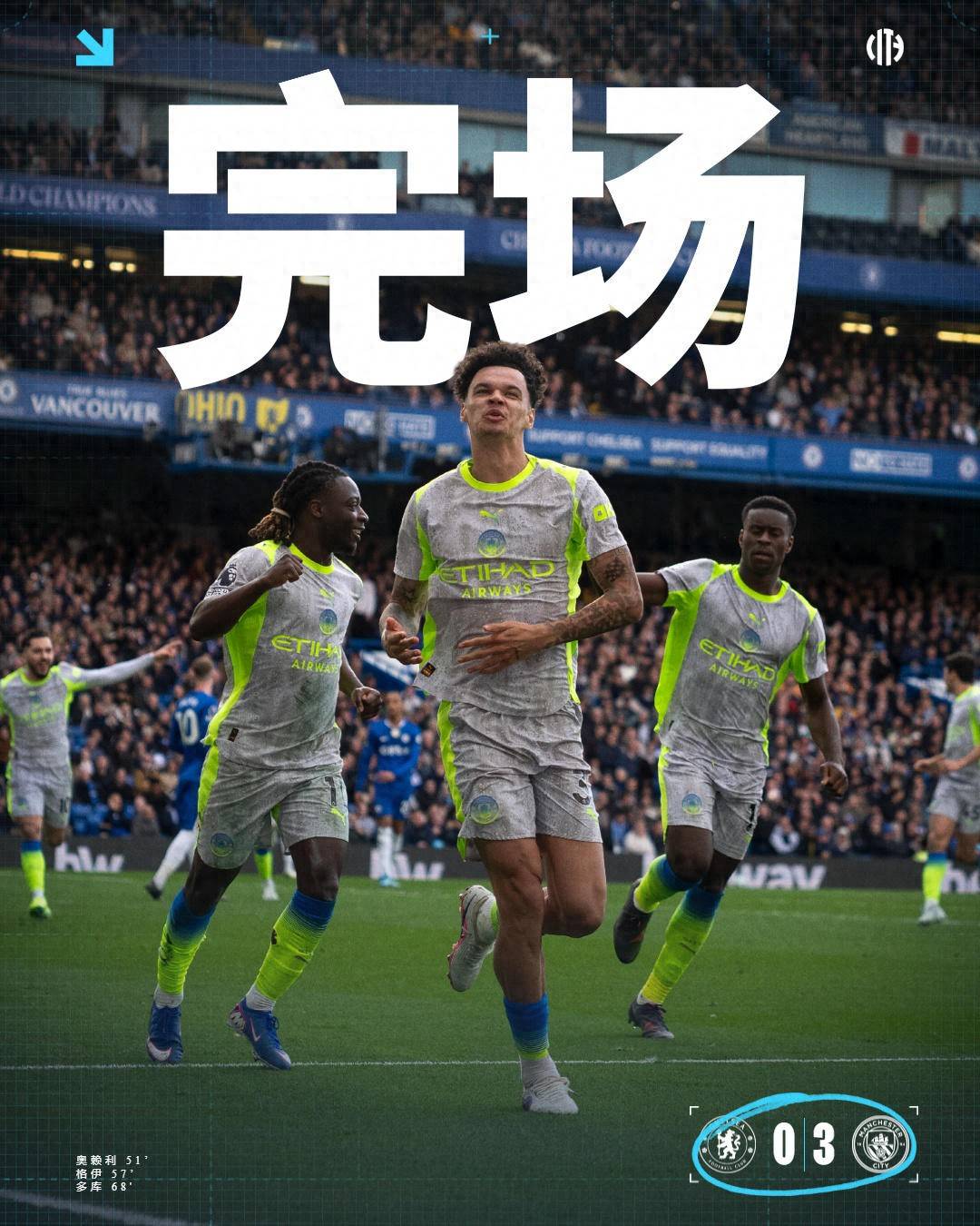 ในนาทีที่ 68 นักเตะเชลซี ไคเซเซโด้ ถูกเชอร์กิและโดกุเสมอกันในแดนหลัง หลังจากโดกุขโมยเข้าเขตโทษและดันยิงเชลซี 0-3 แมนเชสเตอร์ ซิตี้ เชลซีเสียไป 15 ประตูจาก 5 เกมหลังสุดกับทีมลีกสูงสุด รวม 8 ประตู จาก 2 เกม โดย ปารีส แซงต์ แชร์กแมง ในแชมเปี้ยนส์ลีก