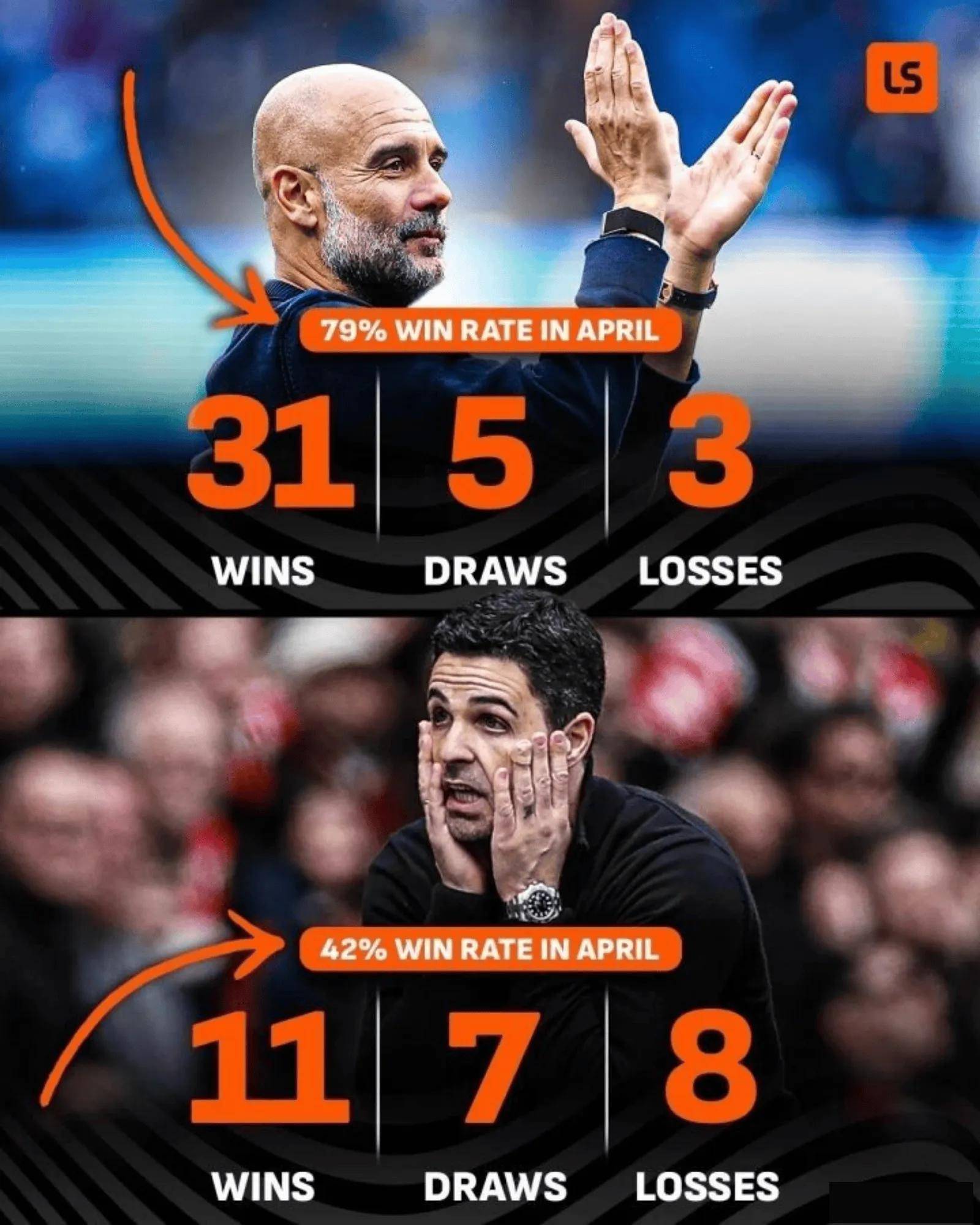 ในทางตรงกันข้าม เมษายนเป็นเดือนที่มีผลงานแย่ที่สุดสำหรับอาร์เตต้ากับโค้ชอาร์เซนอล โดยมีสถิติชนะ 11 ครั้ง เสมอ 7 แพ้ 8 และอัตราการชนะเพียง 42% ข้างต้นจะนำความมั่นใจมาสู่ผู้เล่นแมนเชสเตอร์ซิตี้มากขึ้นและในขณะเดียวกันก็สร้างแรงกดดันให้กับทีมอาร์เซนอลมากขึ้น