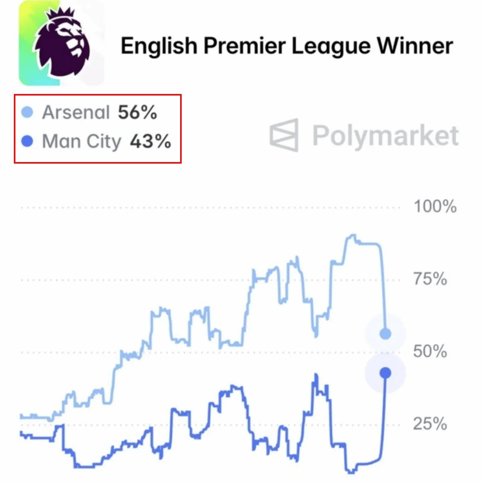 หลังจากรอบสุดท้ายของพรีเมียร์ลีก หน่วยงาน Data Polymarket Sports ได้อัพเดตความน่าจะเป็นของ Arsenal และ Manchester City ที่คว้าแชมป์ อดีตร่วงลงจาก 91% เป็น 56% และแมนเชสเตอร์ซิตี้เพิ่มขึ้นเป็น 43%