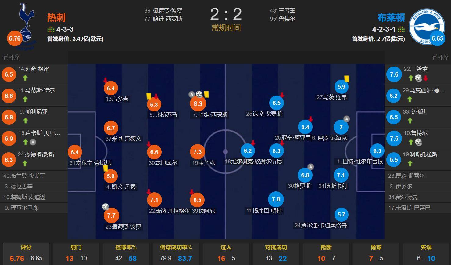 ในเกมทั้งหมด อัตราการครอบครองของท็อตแนมอยู่ที่ 42% รวม 13 นัด โดยยิงเข้ากรอบ 6 นัด ไบรตันมีทั้งหมด 10 นัด รวม 3 นัด