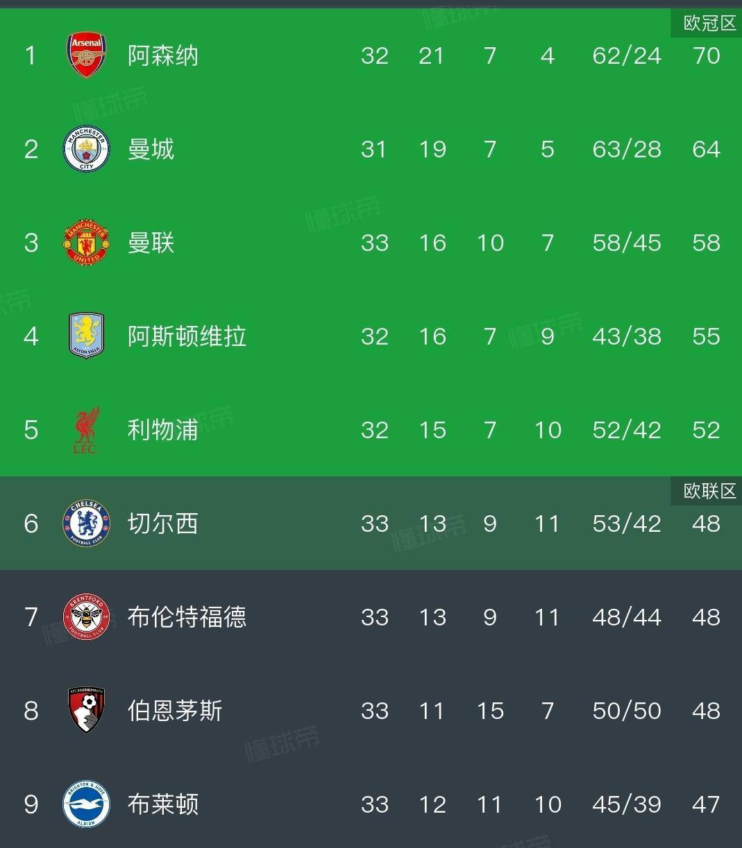 แมนเชสเตอร์ ยูไนเต็ด ทำได้ 58 แต้ม หลังเอาชนะ เชลซี ได้อันดับสาม แอสตัน วิลล่า อยู่ในอันดับที่สี่ด้วย 55 คะแนน และลิเวอร์พูลอยู่ในอันดับที่ 5 ด้วยคะแนน 52 คะแนน
