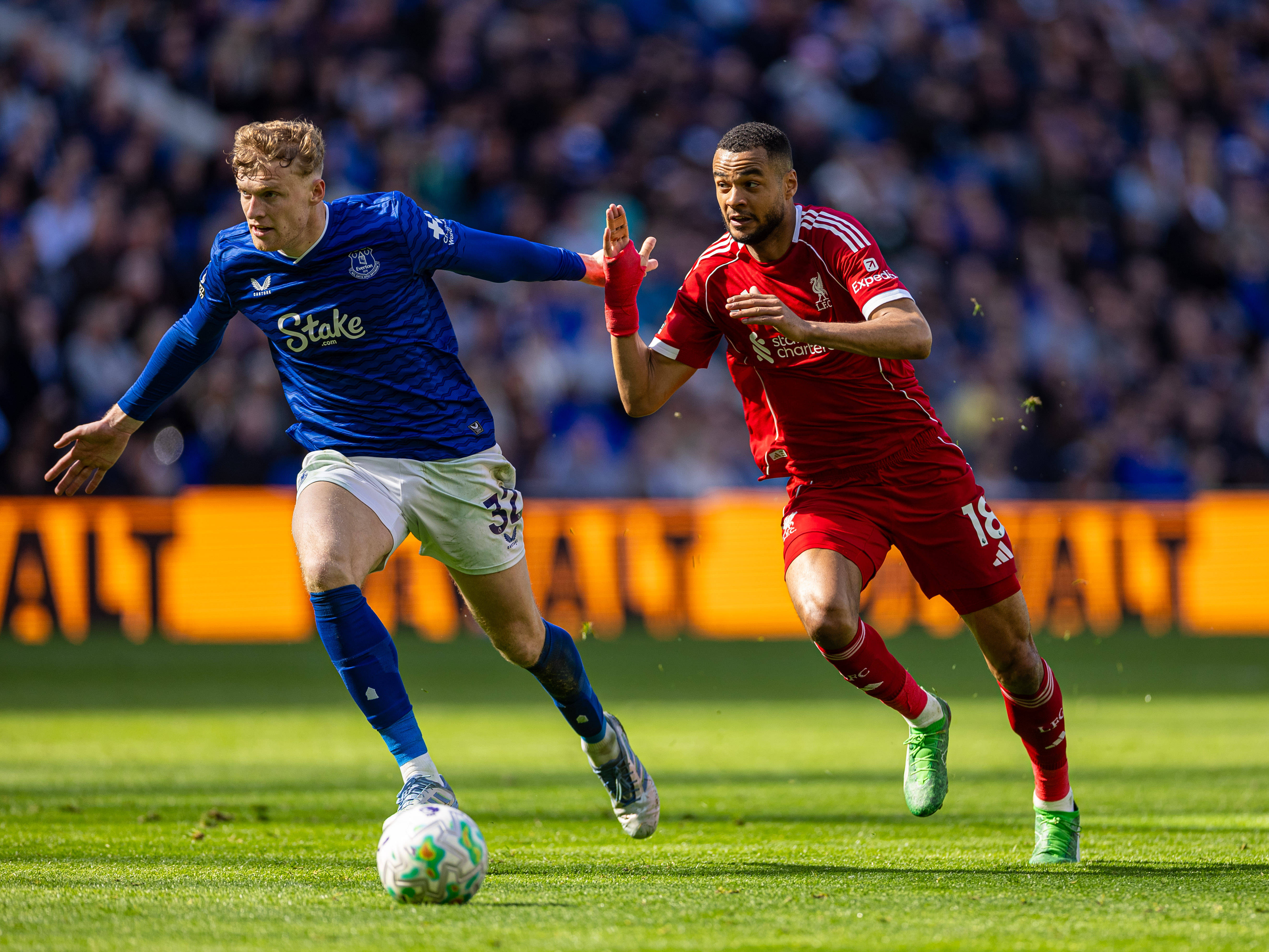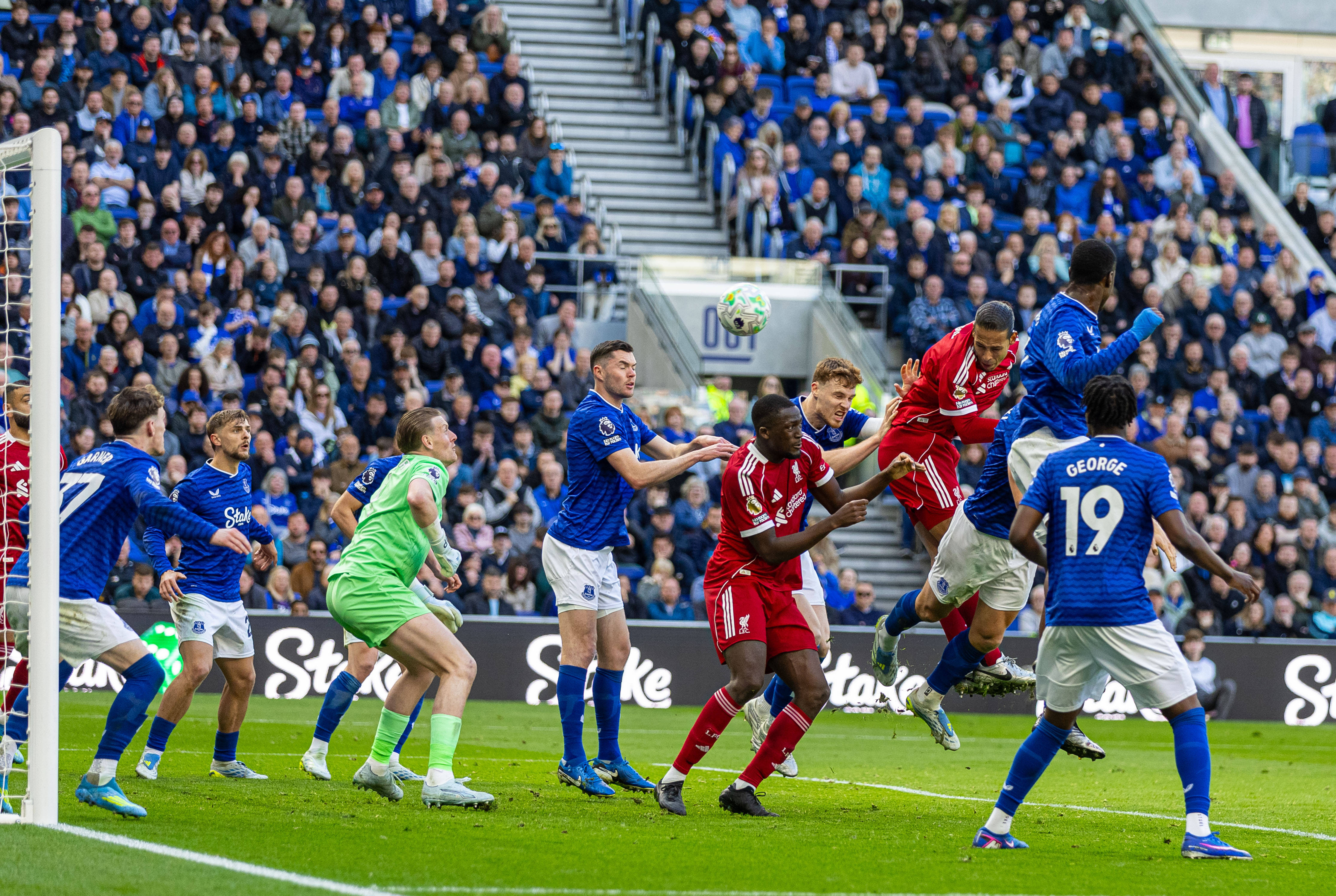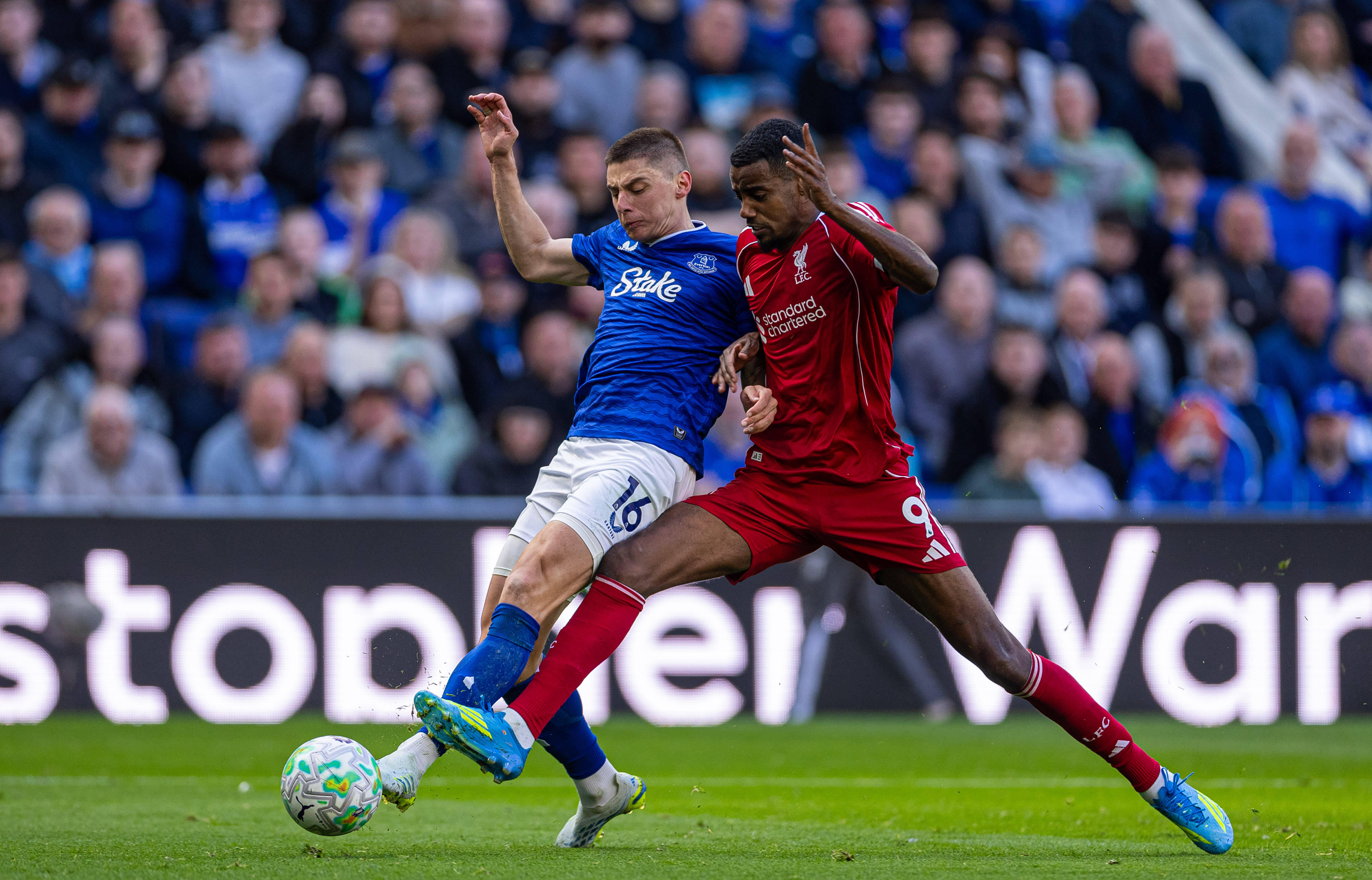 ผู้เล่น Liverpool Gakebo (ขวา) เมื่อวันที่ 19 เมษายน ต่อสู้กับผู้เล่น Everton Branswaite สำนักข่าวซินหัว
