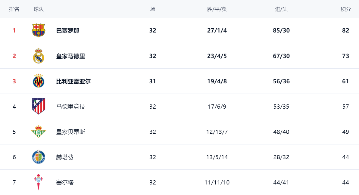 ในอันดับ บาร์เซโลน่า ครองอันดับ 27 เสมอ 1 เสมอ 1 และแพ้ 4 แต้ม 82 แต้ม สถิติของเรอัล มาดริด คือ ชนะ 23 เสมอ 4 แพ้ 5 แต้ม เพียง 73 แต้ม รั้งอันดับ 2 หลัง บาร์เซโลน่า 9 แต้ม และความหวังในการคว้าแชมป์ค่อนข้างน้อย บียาร์เรอัลทำคะแนนได้ 61 คะแนน อันดับที่สาม แอตเลติโก มาดริด ยังเสีย 57 แต้ม รั้งอันดับสี่ ที่ห้าคือ Royal Betis ซึ่งทำคะแนนได้ 49 คะแนน Hertafe และ Celta ทั้ง 44 คะแนน, 6 และ 7