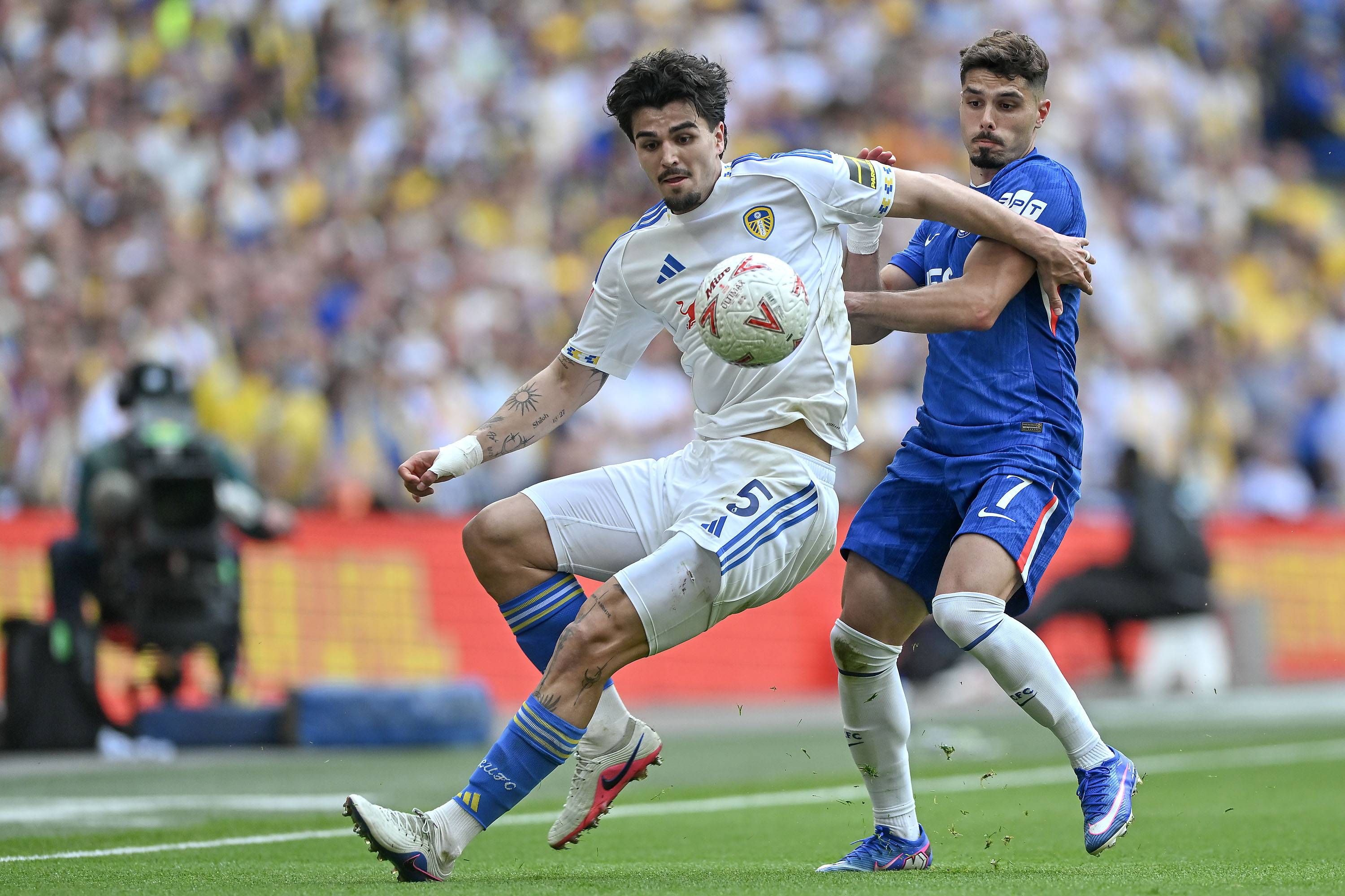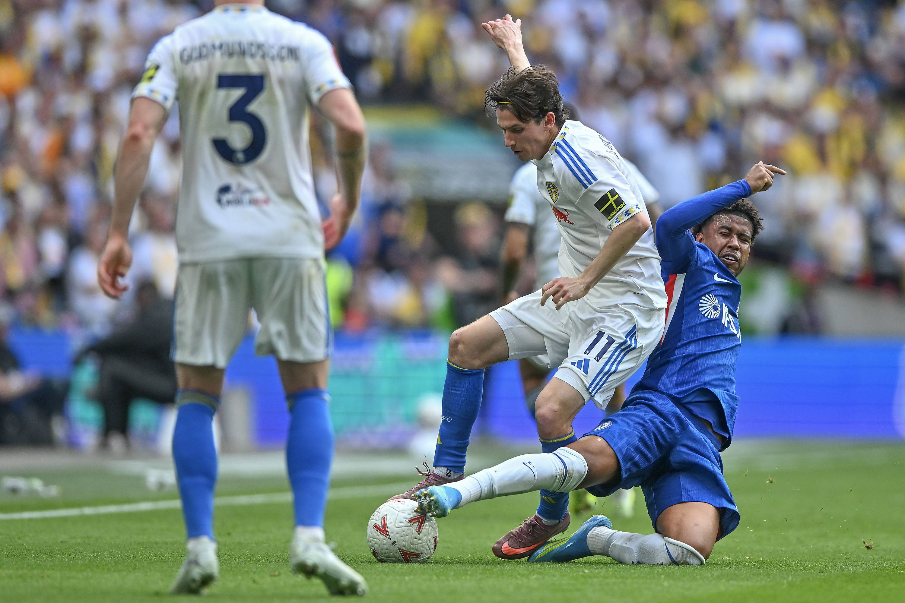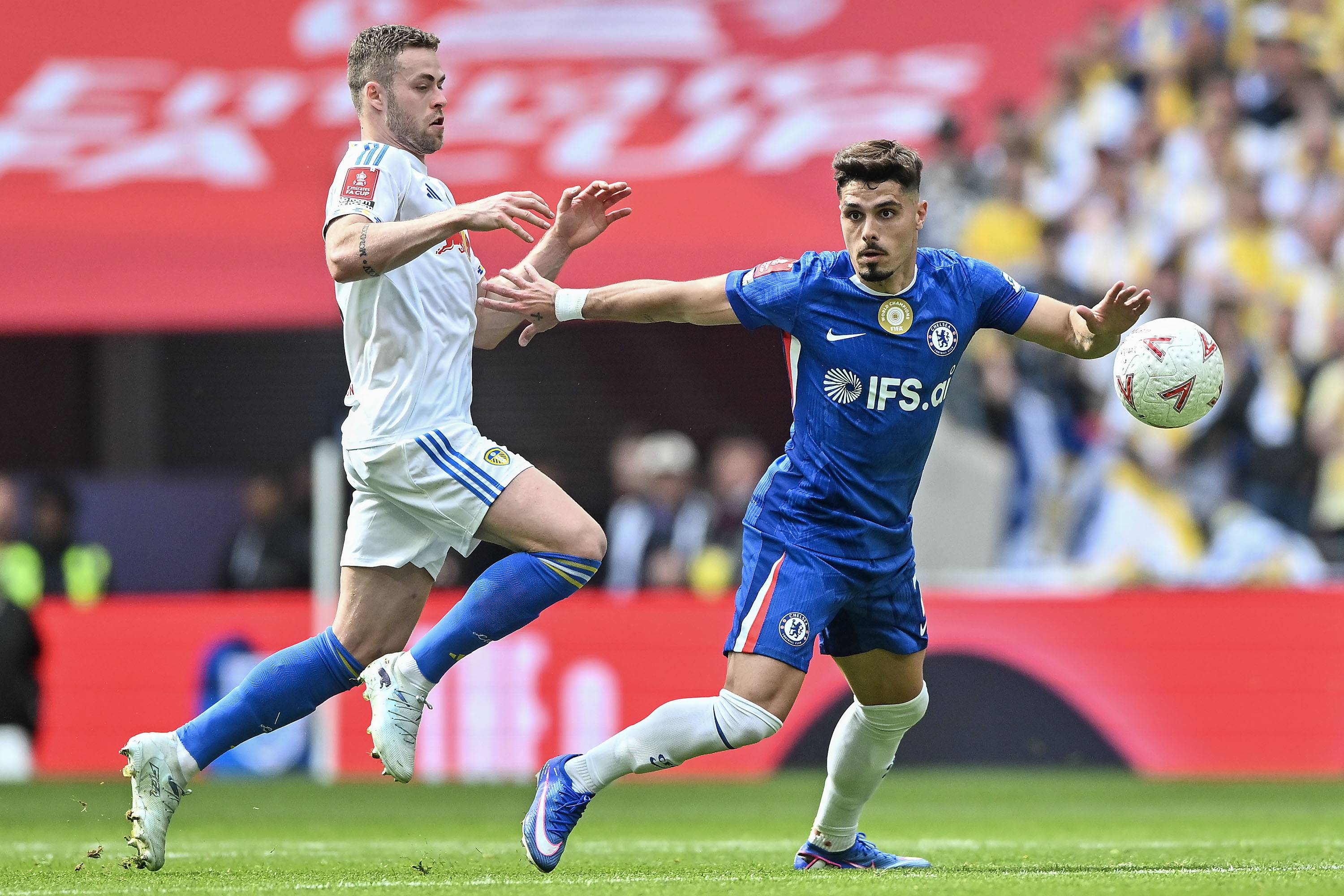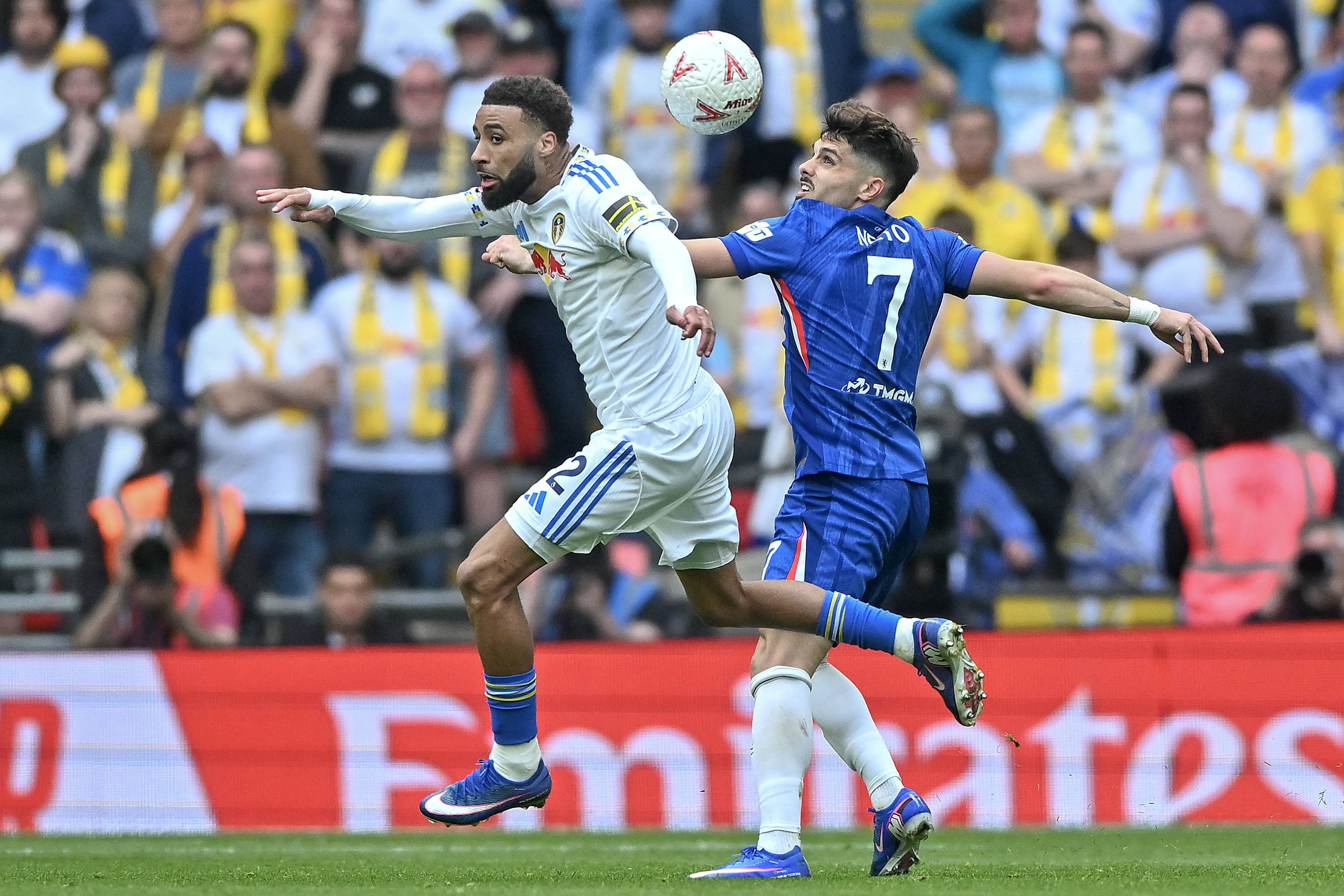 เนโต้ นักเตะเชลซี (ขวา) ในวันที่ 26 เมษายน ต่อสู้กับ โบเกล นักเตะลีดส์ ยูไนเต็ด สำนักข่าวซินหัว/OU XIN