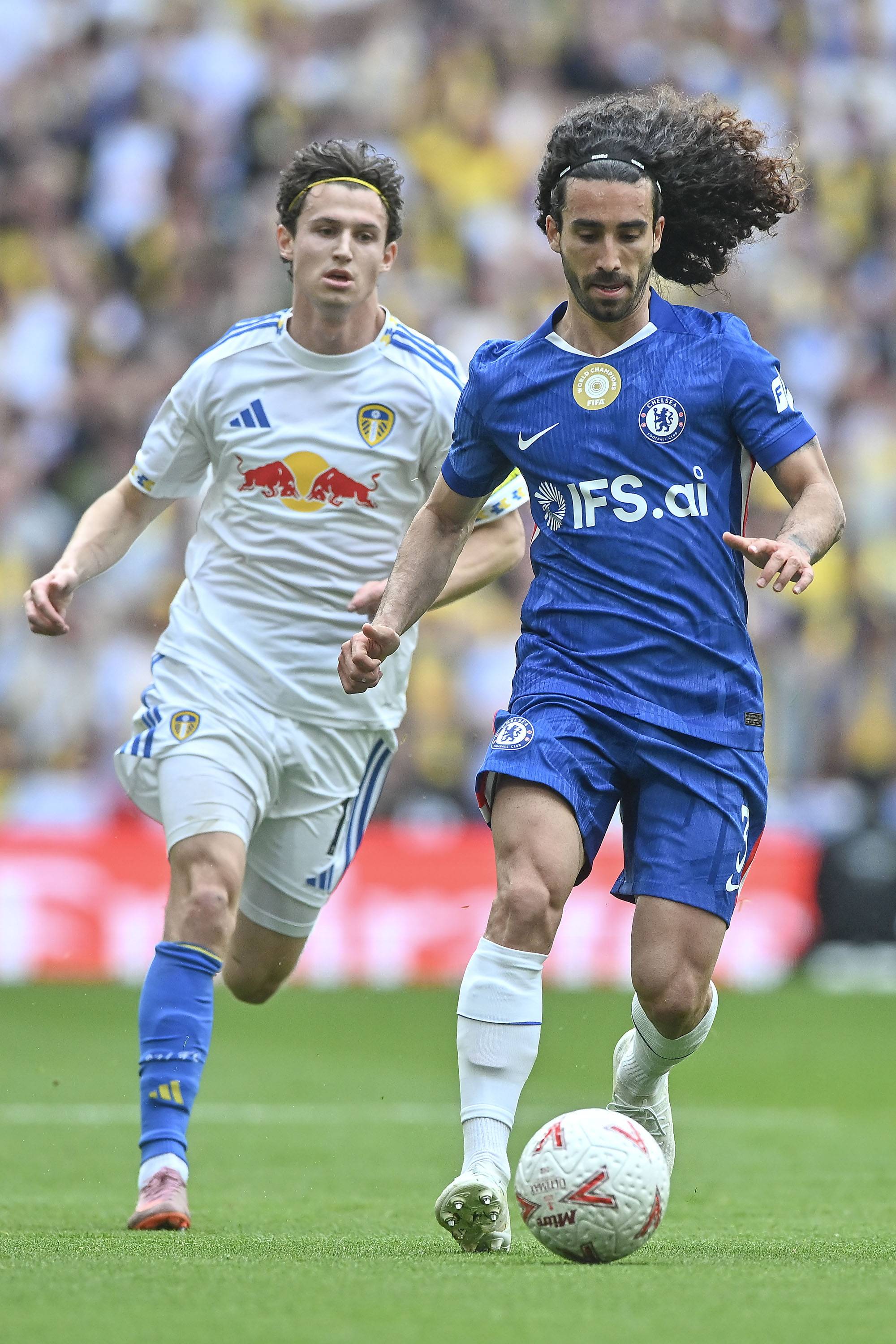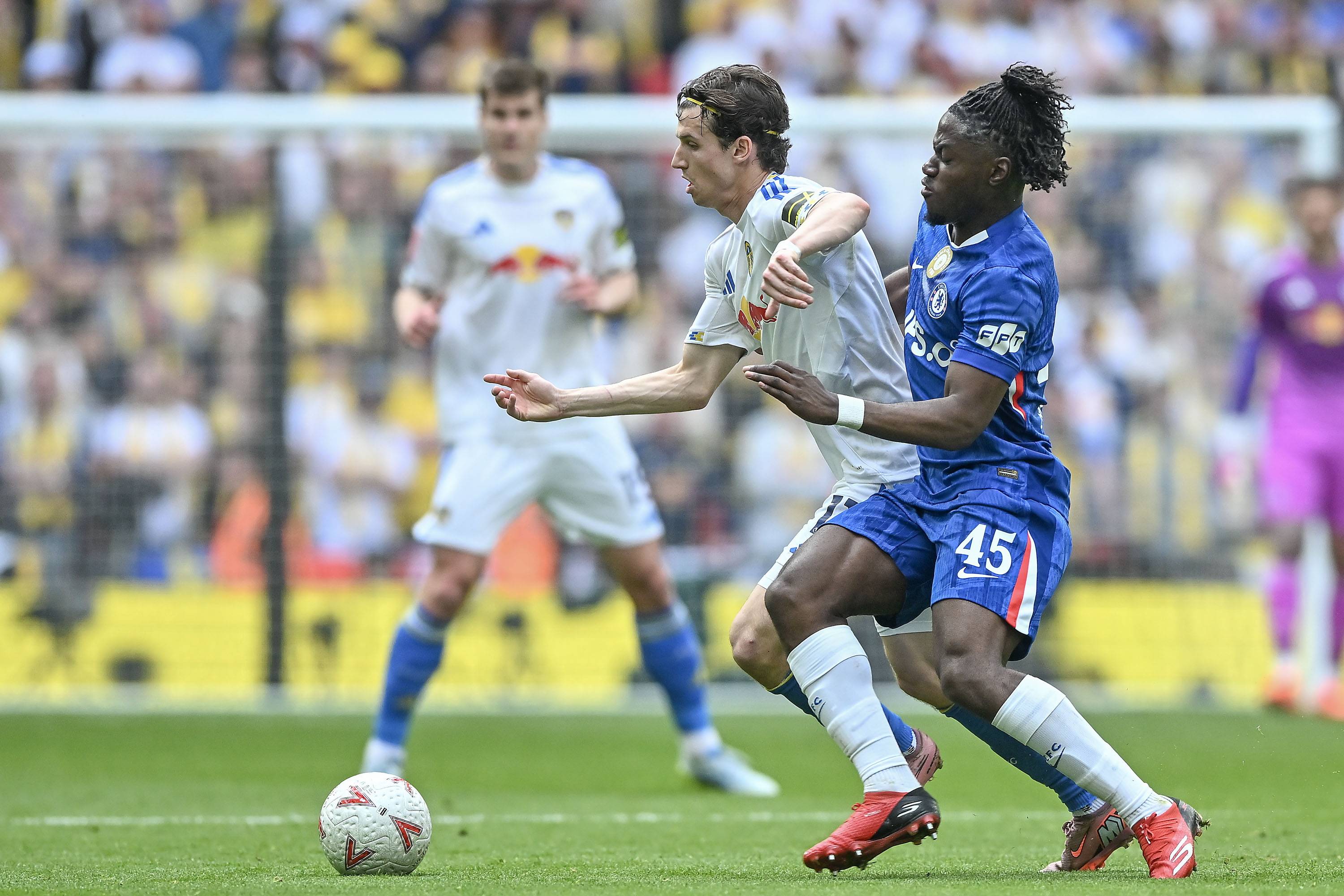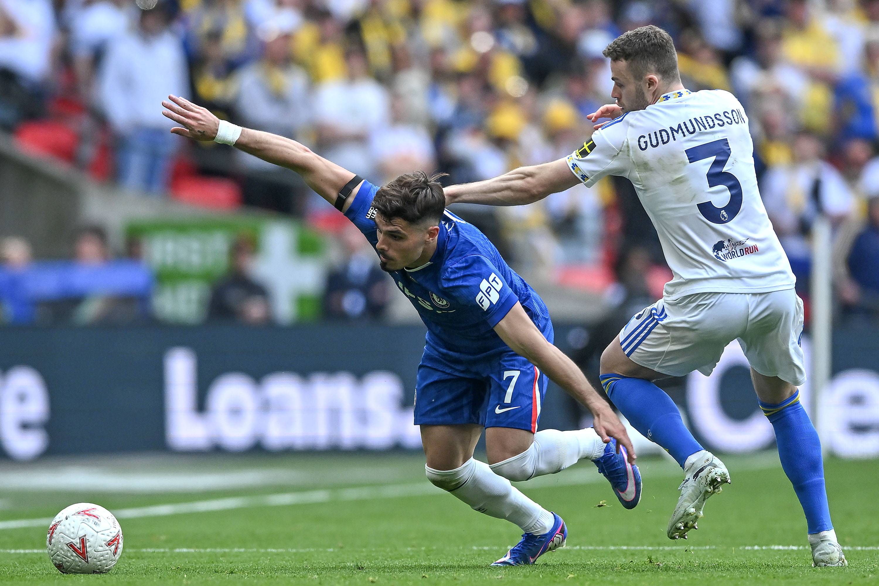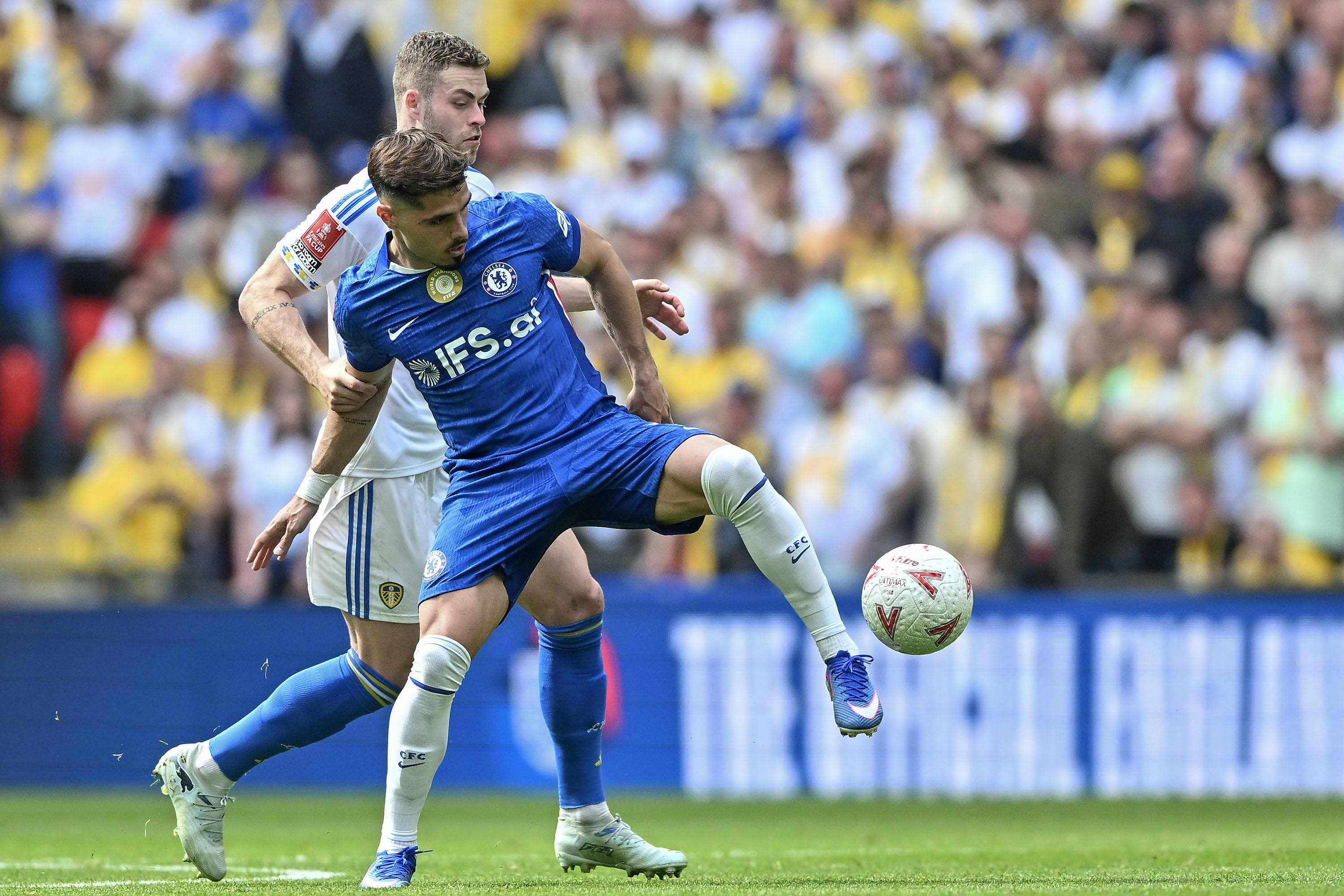 เนโต้ นักเตะเชลซี (ขวา) ในวันที่ 26 เมษายน ต่อสู้กับ โบเกล นักเตะลีดส์ ยูไนเต็ด สำนักข่าวซินหัว/OU XIN