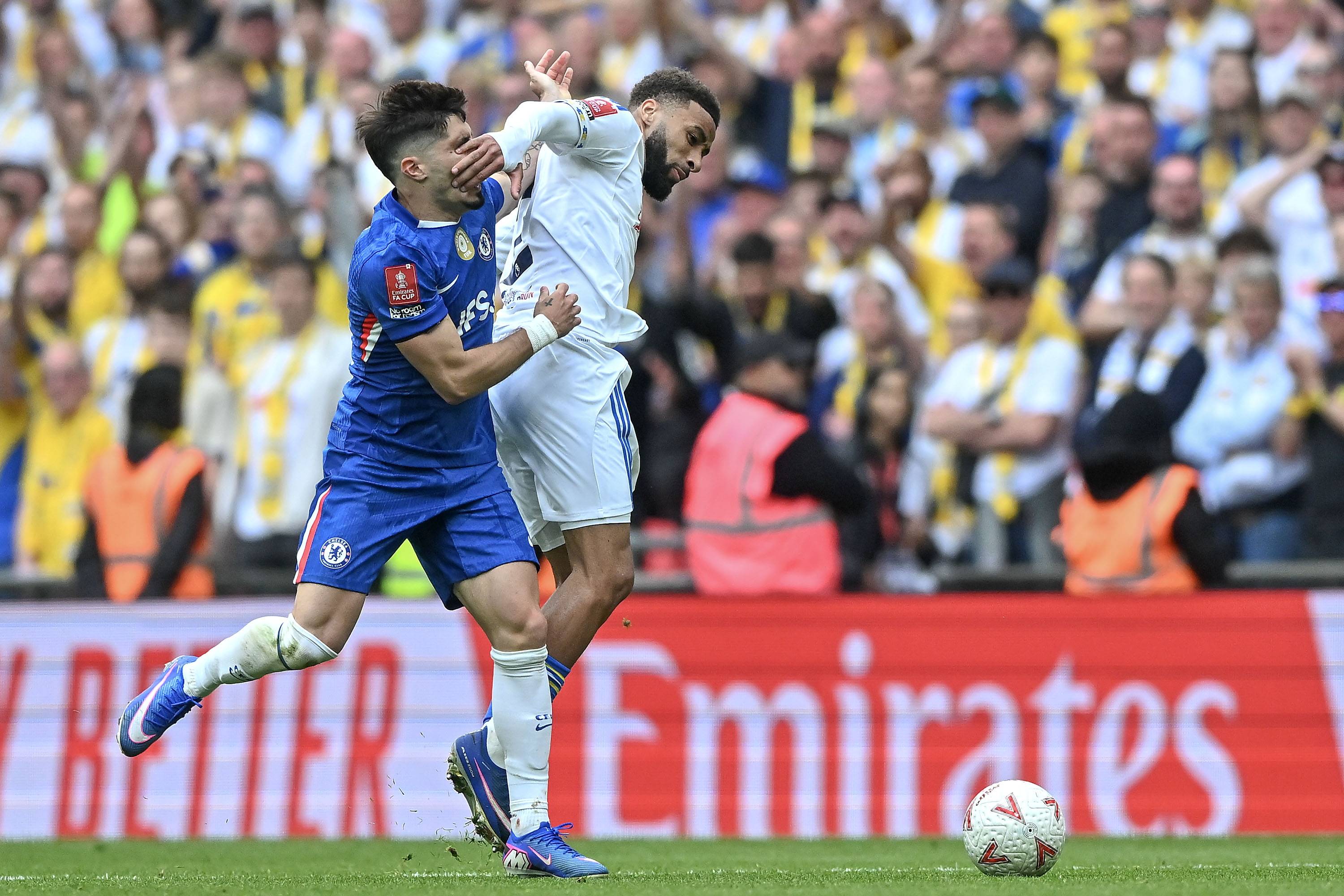 เนโต้ นักเตะเชลซี (ขวา) ในวันที่ 26 เมษายน ต่อสู้กับกู๊ดมอนสัน นักเตะลีดส์ ยูไนเต็ด สำนักข่าวซินหัว/OU XIN