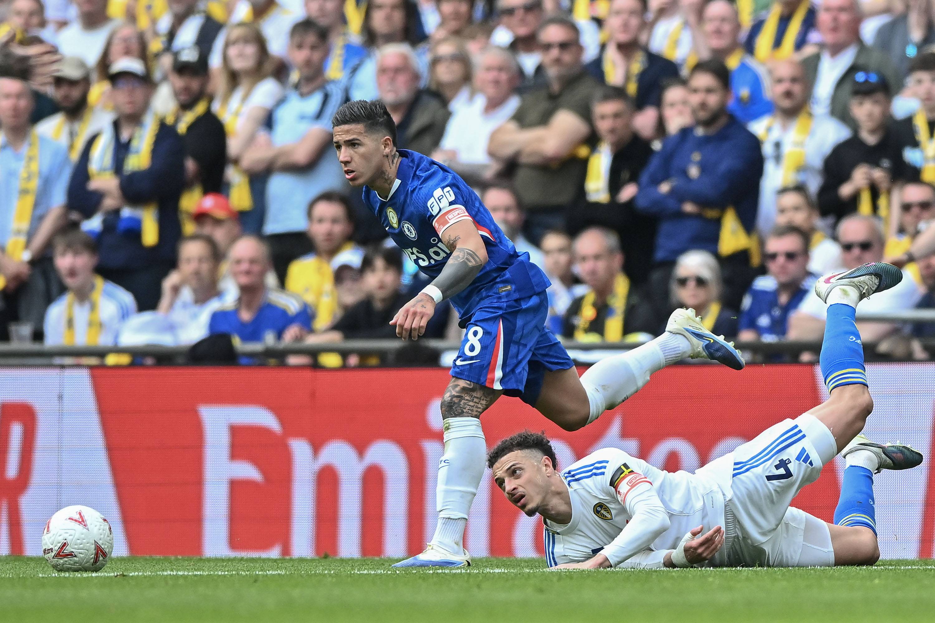 เฟร์นานเดซ นักเตะเชลซี 26 เมษายน (ซ้าย) ต่อสู้กับผู้เล่น Leeds United Ampadou สำนักข่าวซินหัว/OU XIN