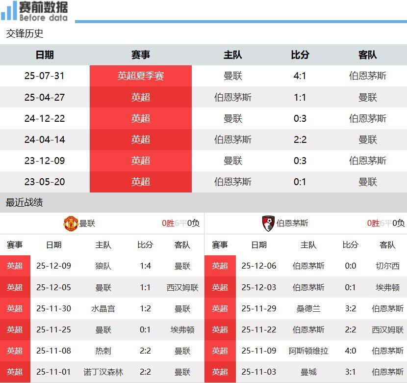 อันดับปัจจุบันของทั้งสองทีม หลังจากผ่านไป 15 นัดในพรีเมียร์ลีก แมนเชสเตอร์ ยูไนเต็ด อยู่ในอันดับที่ 8 มี 25 คะแนน จากชัยชนะ 7 นัด เสมอ 4 นัด และแพ้ 4 นัด; บอร์นมัธ อยู่ในอันดับที่ 15 มี 20 คะแนน จากชัยชนะ 5 นัด เสมอ 5 นัด และแพ้ 5 นัดในการแข่งขันพรีเมียร์ลีกครั้งก่อน แมนเชสเตอร์ ยูไนเต็ด คว้าชัยชนะอย่างถล่มทลาย 4-1 ในเกมเยือนกับวูล์ฟแฮมป์ตัน วันเดอเรอร์ส รักษาสถิติไร้พ่ายด้วยการชนะ 2 นัดและเสมอ 1 นัดจาก 3 นัดหลังสุดในลีก ในทางกลับกัน บอร์นมัธ เสมอกับเชลซี 0-0 ในบ้าน ทำให้พวกเขาไม่ชนะใครในลีก 6 นัดติดต่อกัน ซึ่งประกอบด้วย 2 นัดและแพ้ 4 นัด สะท้อนให้เห็นถึงช่วงฟอร์มที่ย่ำแย่ ประการที่สอง การฟื้นตัวอย่างค่อยเป็นค่อยไปของแมนเชสเตอร์ ยูไนเต็ด และข้อได้เปรียบในการเล่นในบ้านฟอร์มการเล่นของแมนเชสเตอร์ ยูไนเต็ดยังไม่คงเส้นคงวา แต่ด้วยการปรับตัวของผู้เล่นใหม่และการกลับมาของนักเตะที่บาดเจ็บ ผลงานของทีมกำลังพัฒนาอย่างไม่ต้องสงสัย อย่างไรก็ตาม บอร์นมัธมีแนวโน้มที่จะเริ่มต้นได้ดีแต่ค่อยๆ เสื่อมลง แม้จะเริ่มต้นฤดูกาลได้อย่างแข็งแกร่งก็ตาม พวกเขาไม่ชนะในลีกมาแล้วหกเกมติดต่อกัน ซึ่งเป็นการตกต่ำของฟอร์มอย่างชัดเจน ในเกมนี้ แมนเชสเตอร์ ยูไนเต็ดได้เปรียบจากการเล่นในบ้านและมีขุมกำลังที่ค่อนข้างสมบูรณ์ ดังนั้นพวกเขาจึงถูกคาดหมายว่าจะสามารถคว้าชัยชนะในบ้านได้อย่างน่าประทับใจเหนือบอร์นมัธหากยูไนเต็ดสามารถคว้าชัยชนะที่โอลด์ แทรฟฟอร์ดได้ พวกเขาจะกระโดดขึ้นไปอยู่ในอันดับที่ห้าของตารางพรีเมียร์ลีก (โซนโควต้ายูฟ่า แชมเปียนส์ลีก) ซึ่งหมายความว่าขวัญกำลังใจของทีมอยู่ในระดับสูงมาก เมื่อพิจารณาผลงานการพบกันล่าสุดของทั้งสองทีม พบว่าเป็นการแข่งขันที่สูสีกันมากในหกนัดหลังสุด โดยแมนเชสเตอร์ ยูไนเต็ด และบอร์นมัธ ต่างเก็บชัยชนะได้ทีมละสองนัด เสมอกันสองนัด และแพ้สองนัด – ถือเป็นสถานการณ์ที่ยังไม่มีฝ่ายใดได้เปรียบอย่างชัดเจน สุดท้าย สถานการณ์การบาดเจ็บของทั้งสองทีม: แมนเชสเตอร์ ยูไนเต็ด จะไม่มีแฮร์รี แม็กไกวร์, มัตไธส์ เดอ ลิกต์ และโอเล็กซานเดอร์ ซินเชนโก้ (น่าสงสัย); ขณะที่บอร์นมัธจะขาดคริส คุก, เบน โด๊ค, คัลลัม คริสตี้, จานลูก้า เซเนซี และวิลเฟร็ด อักบอนลาฮอร์ ทั้งหมดเนื่องจากอาการบาดเจ็บ