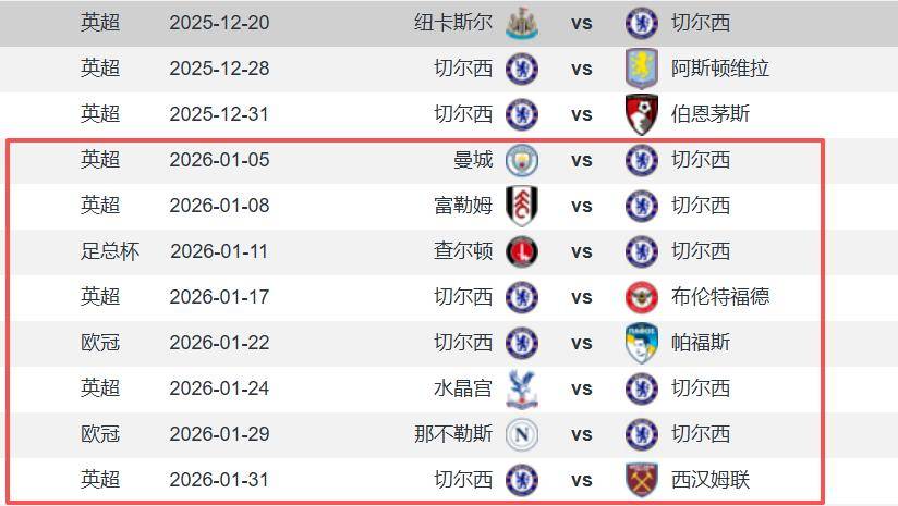 โปรแกรมการแข่งขันของเชลซีในเดือนมกราคมมีดังนี้: