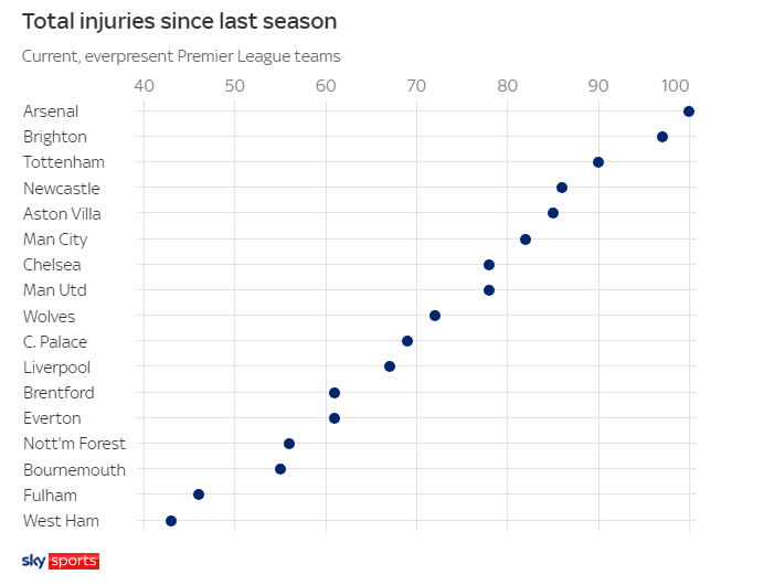 ไบรตันครองอันดับสองในรายการด้วยจำนวนผู้บาดเจ็บทั้งหมด 97 ราย ขณะที่ท็อตแนม ฮ็อตสเปอร์อยู่ในอันดับสามด้วยจำนวนผู้บาดเจ็บ 90 รายสิ่งที่น่าสังเกตเป็นพิเศษคือ ในบรรดา 'บิ๊กซิกซ์' ของพรีเมียร์ลีก สถานการณ์การบาดเจ็บของลิเวอร์พูลนั้นดีกว่าคู่แข่งอย่างเห็นได้ชัด ซึ่งเป็นปัจจัยสำคัญในการคว้าแชมป์พรีเมียร์ลีกเมื่อฤดูกาลที่แล้ว ในทางตรงกันข้าม ตำแหน่งผู้นำที่โดดเด่นของอาร์เซนอลในตารางพรีเมียร์ลีกและแชมเปียนส์ลีก แม้จะประสบปัญหาการบาดเจ็บถึง 100 ครั้ง ก็ยิ่งน่าทึ่งมากขึ้นไปอีก