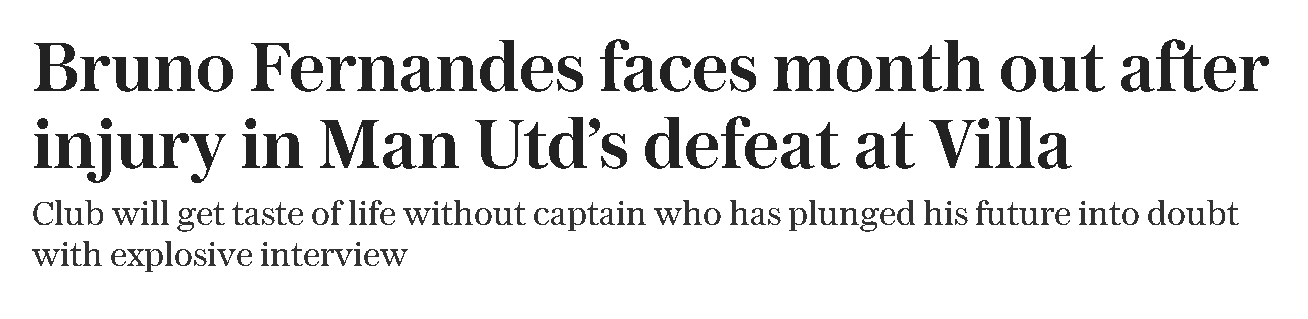 บรูโน่ แฟร์นันด์ส, 'ไอรอนแมน' ของแมนเชสเตอร์ ยูไนเต็ด ที่มีชื่อเสียงในด้านความอดทนต่อการบาดเจ็บ, ในที่สุดก็ทนไม่ไหวในเกมการแข่งขัน. ในระหว่างการแข่งขันที่แพ้ให้กับแอสตัน วิลล่า 1-2, กองกลางวัย 31 ปี ถูกบังคับให้ออกจากสนามในครึ่งแรก. เดอะ เดลี เทเลกราฟ รายงานว่าเขาอาจต้องพักอย่างน้อยหนึ่งเดือน, ทำให้ปีศาจแดงต้องหาทางเดินต่อไปโดยไม่มีกัปตันของพวกเขา.