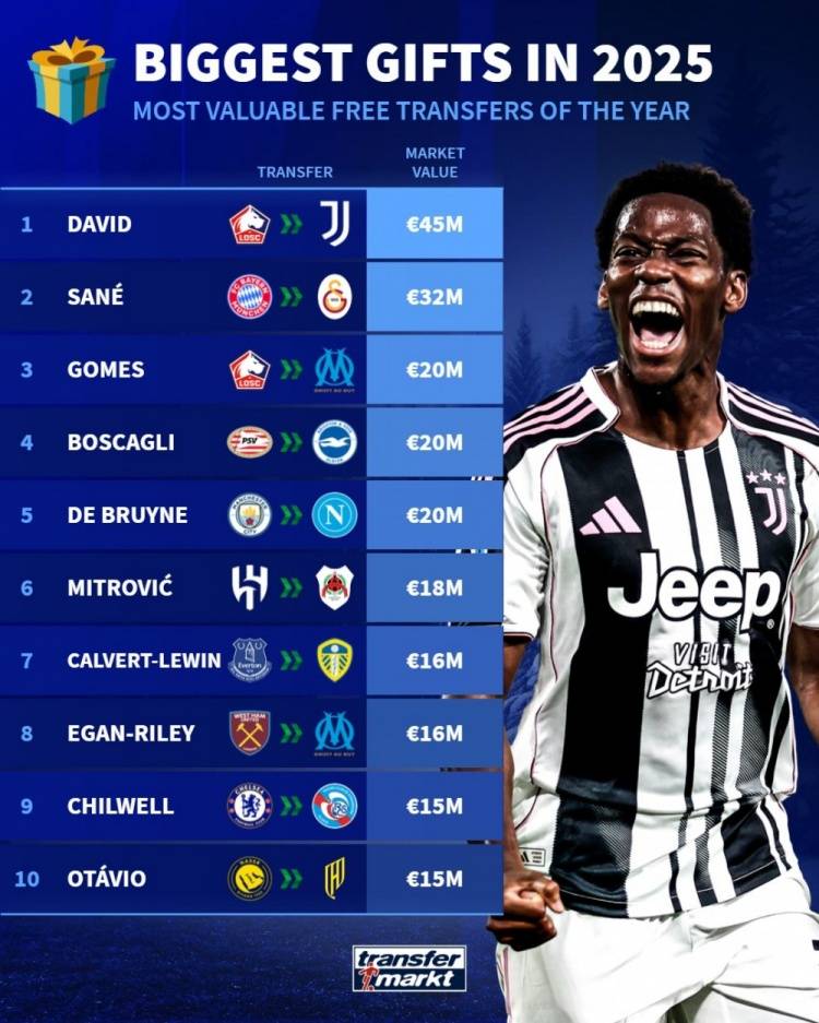เมื่อวันที่ 26 ธันวาคม ตามเวลาปักกิ่ง เว็บไซต์ Transfermarkt ของเยอรมันได้เผยแพร่การจัดอันดับมูลค่าปัจจุบันสำหรับผู้เล่นที่กำลังจะกลายเป็นนักเตะฟรีเอเยนต์ในปี 2025 โดย Jonathan David จากยูเวนตุสครองอันดับหนึ่งด้วยมูลค่า 45 ล้านยูโร ส่วน Sane จากกาลาตาซารายอยู่ในอันดับสองด้วยมูลค่า 32 ล้านยูโร