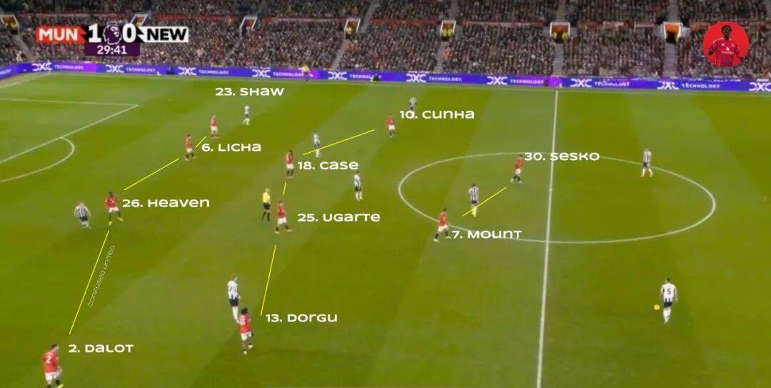 นี่เป็นครั้งแรกในระยะเวลา 13 เดือนที่ Amore ดำรงตำแหน่งที่เขาใช้แผนการเล่น 4-2-3-1 ลุค ชอว์ กลับมาเล่นในตำแหน่งแบ็คซ้ายอีกครั้ง ในขณะที่ Patrik Doge ทำหน้าที่ปีกขวาเหมือนกับที่เขาเคยทำในสมัยที่เล่นให้กับ Lecce ในเซเรีย อา เพื่อเสริมความแข็งแกร่งให้กับฝั่งขวาของทีมร่วมกับ Diogo Dalot Cunha และ Mason Mount เข้ามาแทนที่ Bruno Fernandes ที่บาดเจ็บเพื่อควบคุมเกมรุก