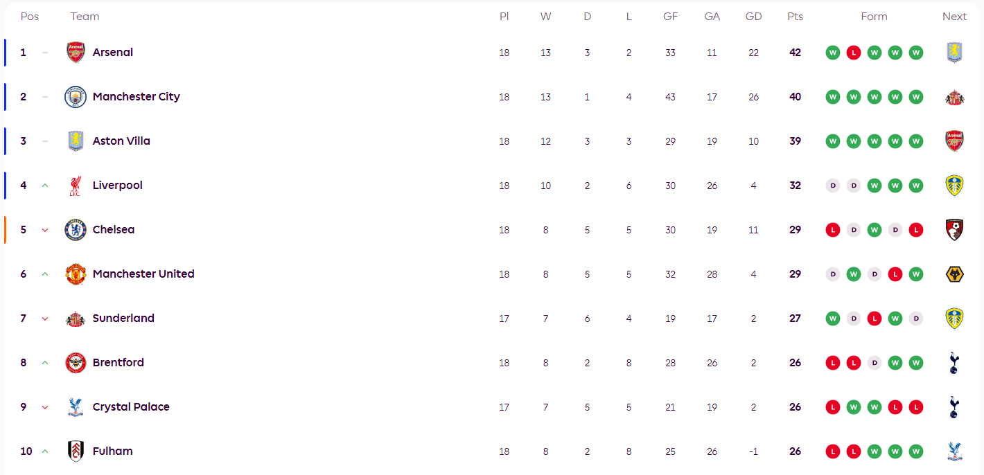 อันดับพรีเมียร์ลีก: ลิเวอร์พูลขึ้นสู่อันดับสี่ เชลซีร่วงไปอยู่อันดับห้า สี่ทีมอันดับบนเสมอ 2-1 ในสี่แมตช์: วิลล่า, ซันเดอร์แลนด์, อาร์เซนอล