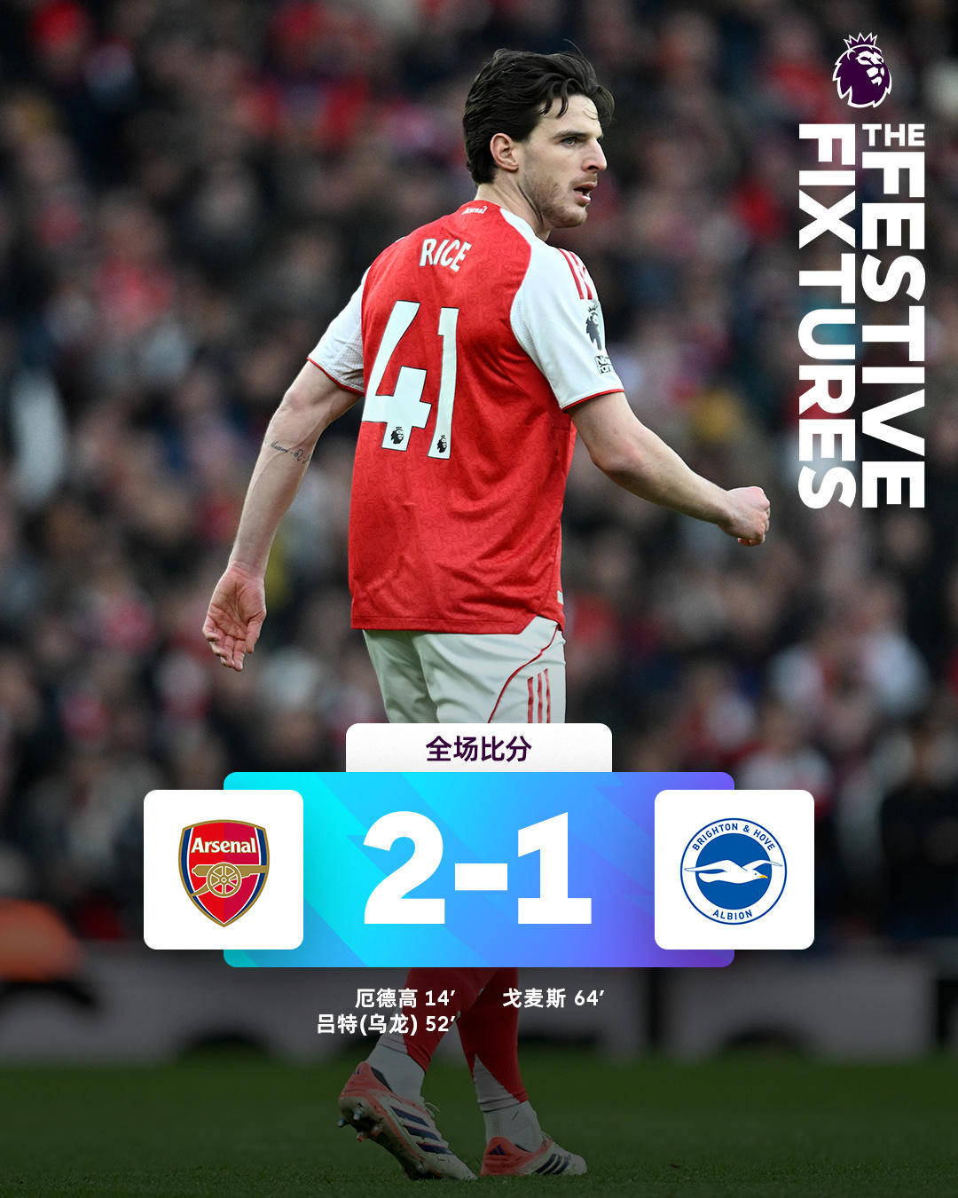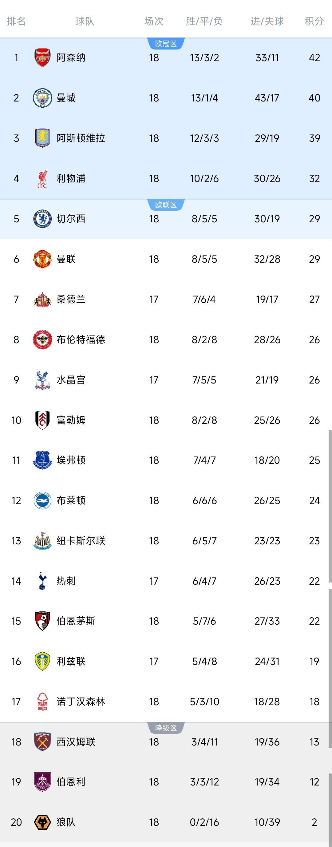 เมื่อวันที่ 28 ธันวาคม เวลาปักกิ่ง ในรอบที่ 18 ของพรีเมียร์ลีก ทีมสามอันดับแรกอย่าง อาร์เซนอล, แมนเชสเตอร์ ซิตี้ และ แอสตัน วิลล่า ต่างคว้าชัยชนะ 2-1 ทั้งหมด เก็บสามแต้มด้วยผลต่างประตูเพียงหนึ่งลูกอาร์เซนอลเอาชนะไบรท์ตัน 2-1 ในบ้าน, แมนเชสเตอร์ ซิตี้เอาชนะน็อตติงแฮม ฟอเรสต์ 2-1 ในเกมเยือน, และแอสตัน วิลล่าเอาชนะเชลซี 2-1 ในเกมเยือน ช่องว่างระหว่างสามทีมอันดับต้นในตารางคะแนนพรีเมียร์ลีกยังคงอยู่ที่สามคะแนน
