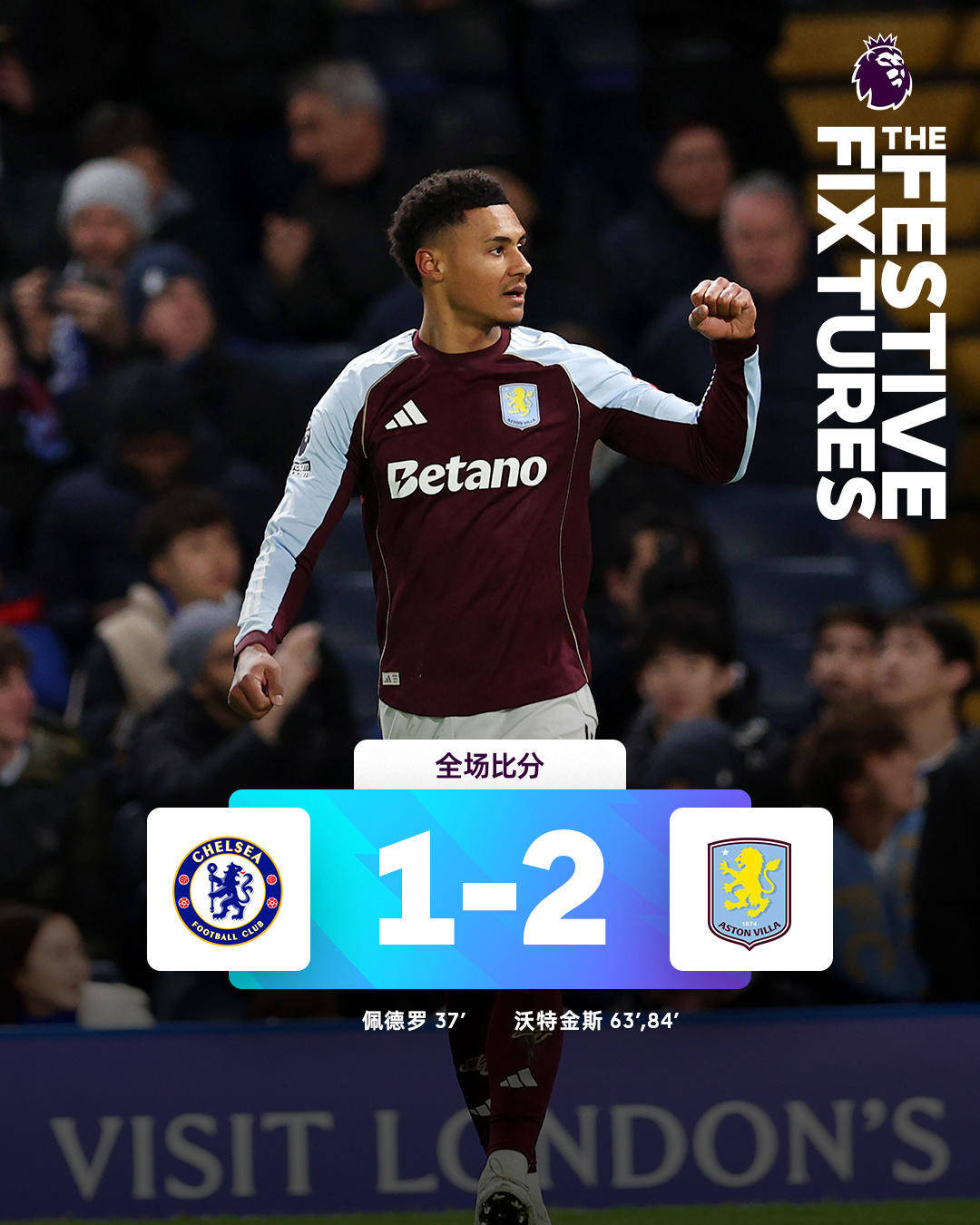 ในการแข่งขันรอบที่ 18 ของพรีเมียร์ลีกฤดูกาล 2025 แอสตัน วิลล่า พลิกสถานการณ์กลับมาเอาชนะเชลซี 2-1 อย่างน่าทึ่งในเกมเยือน โดยออลลี่ วัตต์สัน ผู้เล่นสำรองทำประตูสองลูกเพื่อสร้างการพลิกกลับที่น่าทึ่ง ช่วยให้ทีมทำสถิติชนะติดต่อกันยาวนานที่สุดในประวัติศาสตร์สโมสร 111 ปี