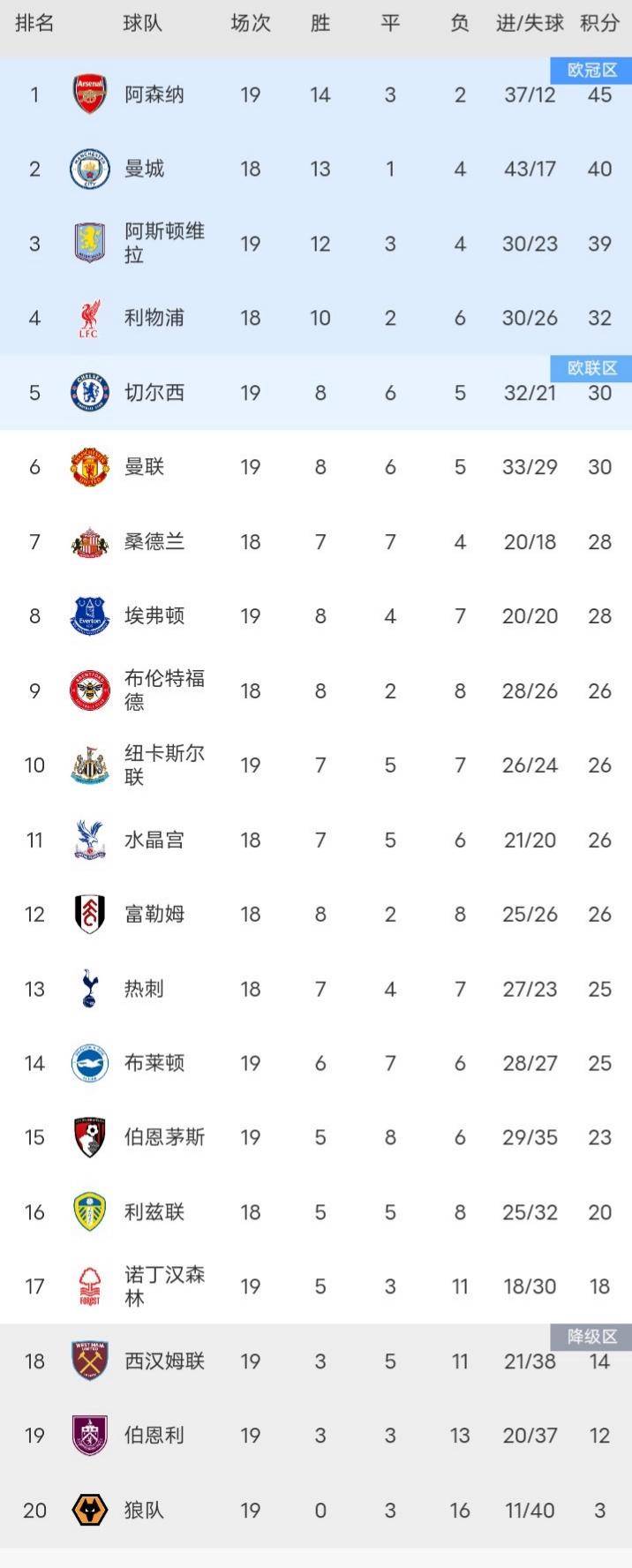 ตารางคะแนนล่าสุดพรีเมียร์ลีก: