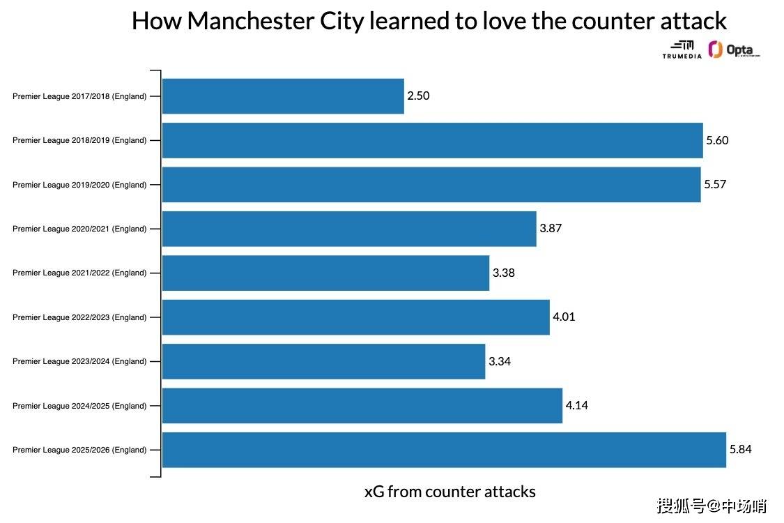 รายละเอียดทางบริบทที่สำคัญเกี่ยวกับภาพนี้คือ ข้อมูลไม่ได้ถูกปรับตามเวลาหรือเฉลี่ยต่อการแข่งขัน ในความเป็นจริง ค่าคาดการณ์ประตู (xG) จากการโต้กลับของแมนเชสเตอร์ซิตี้ใน 18 นัดแรกของฤดูกาลนี้สูงกว่าค่า xG จากการโต้กลับใน 38 นัดของฤดูกาลก่อนหน้าทั้ง 8 ฤดูกาล