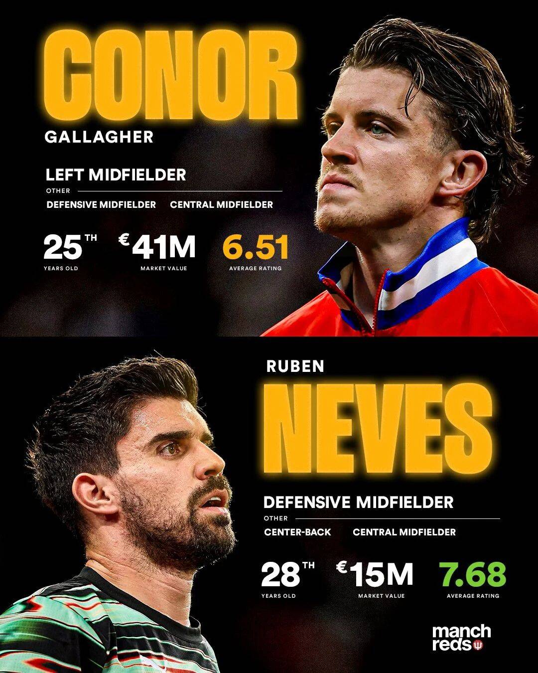 ข่าวลือที่เชื่อมโยงแมนเชสเตอร์ยูไนเต็ดกับคอนอร์ กัลลาเกอร์ของแอตเลติโกมาดริด, ฌาอัว มูตินโญ่ของอัล-นาสร์ และรูเบน เนเวสของวูล์ฟแฮมป์ตัน วันเดอเรอร์ส ได้ดำเนินมาเป็นเวลาหลายเดือนแล้ว ทำให้แฟนบอลไม่รู้สึกแปลกใจแต่อย่างใด ในบรรดาผู้เล่นเหล่านี้ กัลลาเกอร์ได้พูดคุยกับผู้จัดการทีมดีเอโก้ ซิเมโอเน่แล้วเกี่ยวกับว่าเขาควรออกจากแอตเลติโกหรือไม่ เขาจะให้ความสำคัญกับการย้ายทีมที่รับประกันตำแหน่งตัวจริง โดยตั้งเป้าที่จะกลับสู่ทีมชาติอังกฤษก่อนการแข่งขันฟุตบอลโลก
