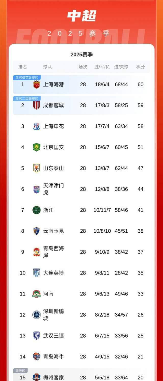 การแข่งขันสี่คู่ไฮไลท์ของรอบที่ 28 เกิดเหตุการณ์พลิกผันที่ไม่คาดคิด: จ่าฝูงของลีก เซี่ยงไฮ้ พอร์ต พ่ายแพ้อย่างน่าตกใจต่อ ซานตง ไท่ซาน รองจ่าฝูง เฉิงตู รงเฉิง คว้าประตูตีเสมอในช่วงทดเวลาบาดเจ็บกับ ชิงเต่า เวสต์โคสต์ เซี่ยงไฮ้ เสิ่นหัว รอดพ้นความพ่ายแพ้ด้วยการเสมอกับ ต้าเหลียน อิงโบ ในช่วงทดเวลาบาดเจ็บ ขณะที่ ปักกิ่ง กั๋วอัน เสียสองประตูในช่วงท้ายเกมและพลิกพ่ายอย่างน่าตกใจต่อ ชิงเต่า ฮั่วเต๋อ